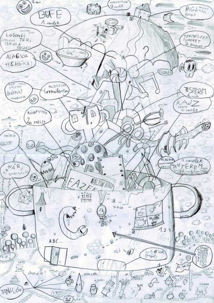 Időkeret: attól függ, mennyire tud elmélyülni az osztály: átlagosan 2 x 45 percet igényel a feladat, de volt olyan osztály, ahol négy héten keresztül (4×45 perc) rajzolták, mert annyi mindent akartak ábrázolni. A bevezető előadás elég hosszú (negyed óra), de tapasztalatom szerint ez kell ahhoz, hogy megértsék, mit várok tőlük.