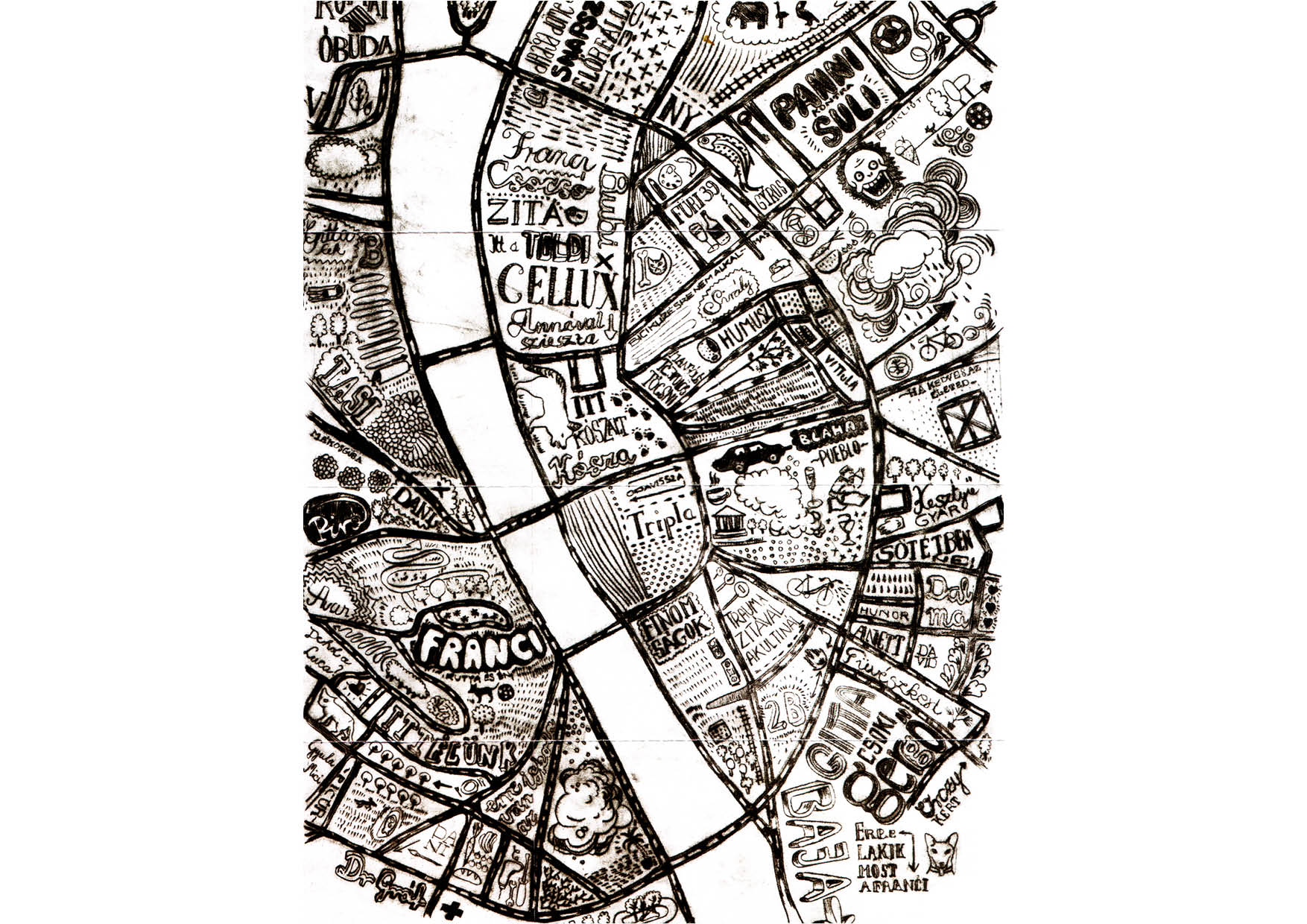 Ez a térkép pedig Budapestet ábrázolja: | This is a subjective map of Budapest: