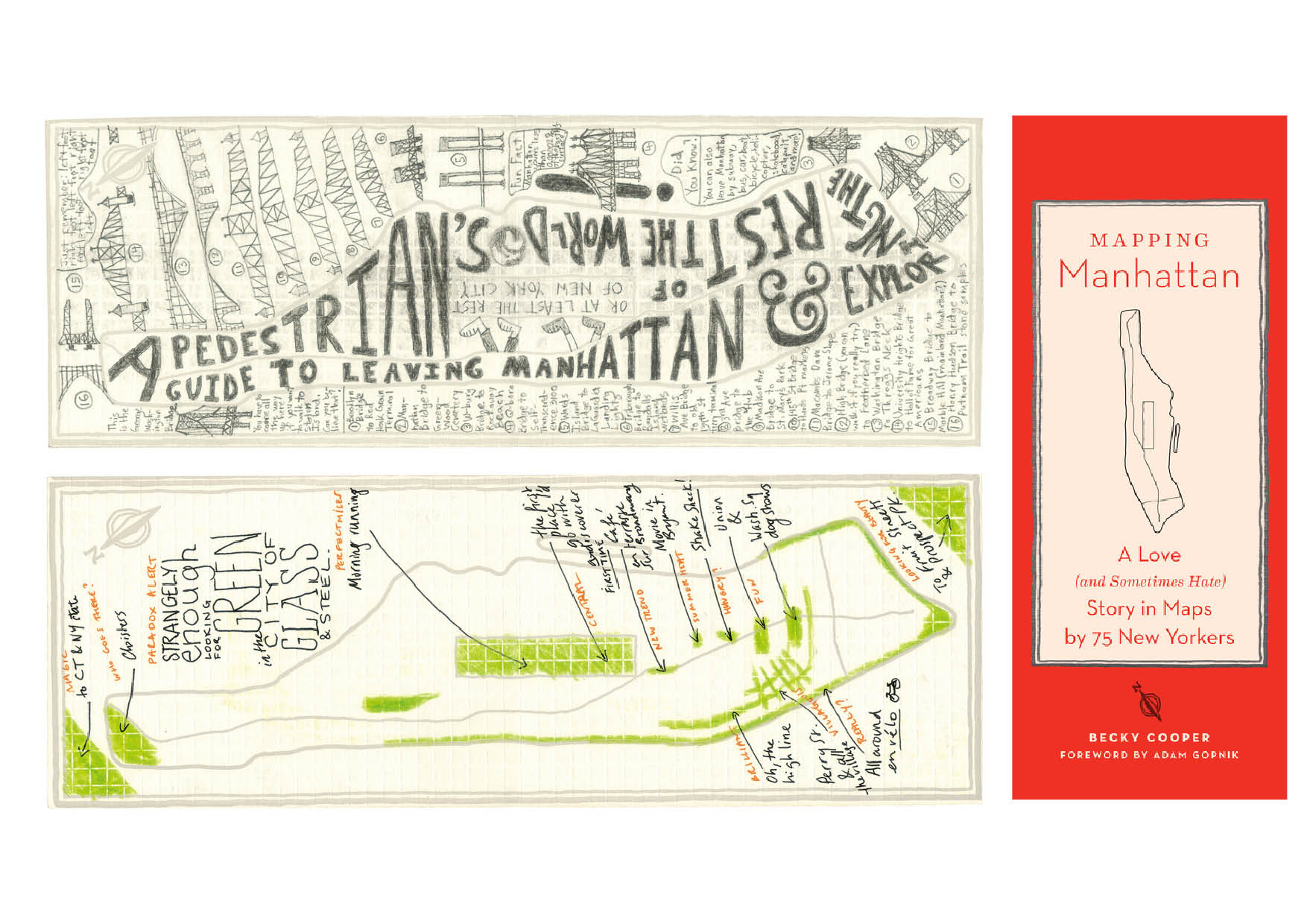 75 new yorki embert kértek fel, hogy ábrázolja Manhattan szigetét, New York egy városrészét. Az első képen egy tipográfiai megközelítést láthattok, ahol betűkből alakította ki a művész a sziget formáját. A papír maradék, üres felületeire a városrészt a szárazfölddel összekötő hidakat, illetve szöveget komponált. A második alkotó azt vallja, hogy ő a felhőkarcolókkal teli üveg-acél városban a parkokat jelölte meg zölddel, számára ez a fontos, biztos van kutyája, vagy szeret futni a szabadban.