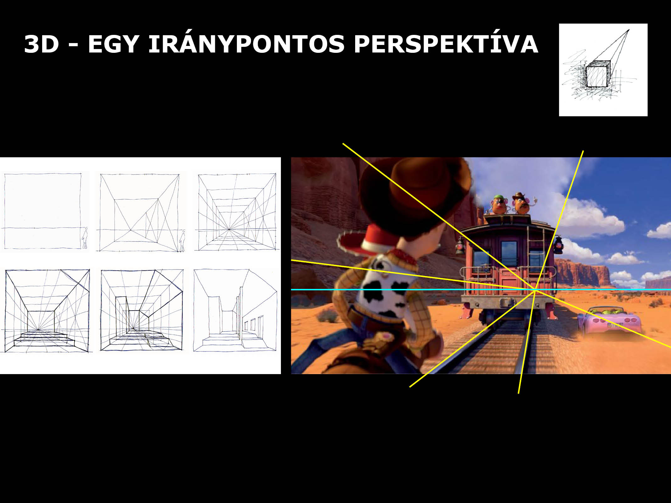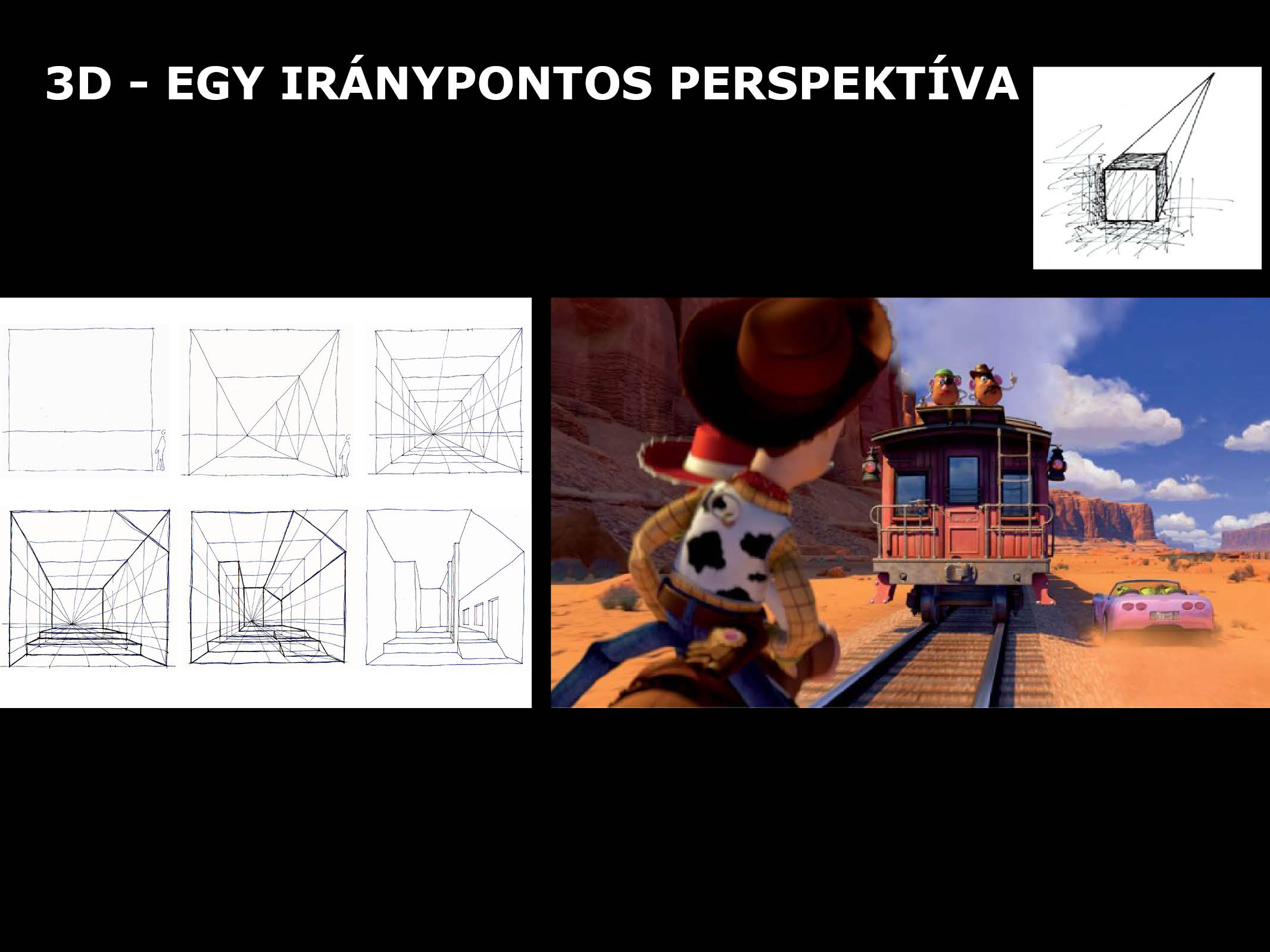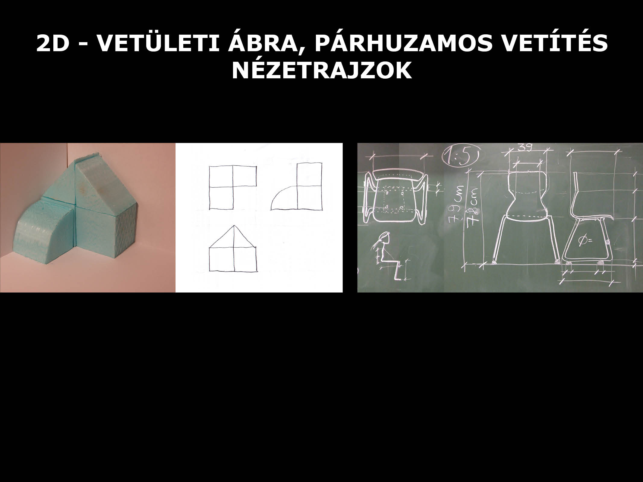 Először a vetítéssel, a diákok által többnyire ismert képeken tisztázzuk a 2D-3D különbségét, az ábrázolási rendszerek törvényszerűségeit. Kérem őket, hogy készítsenek rajzos jegyzetet.