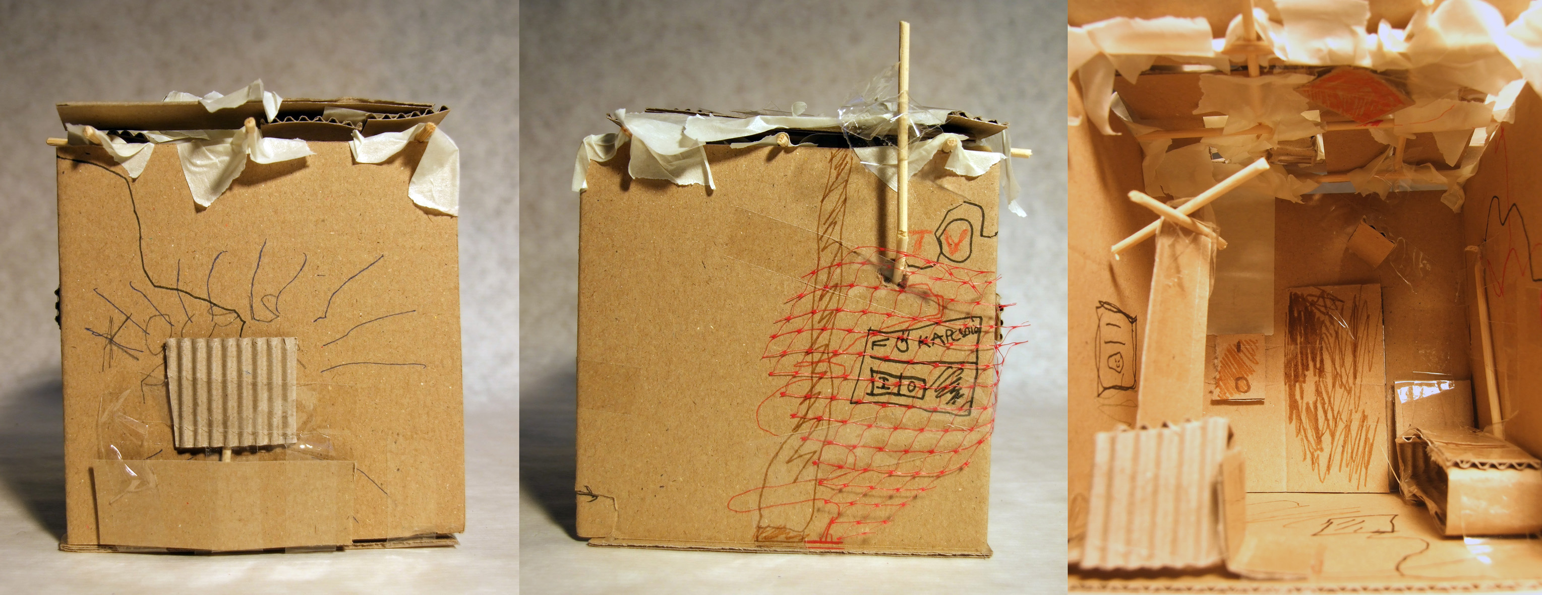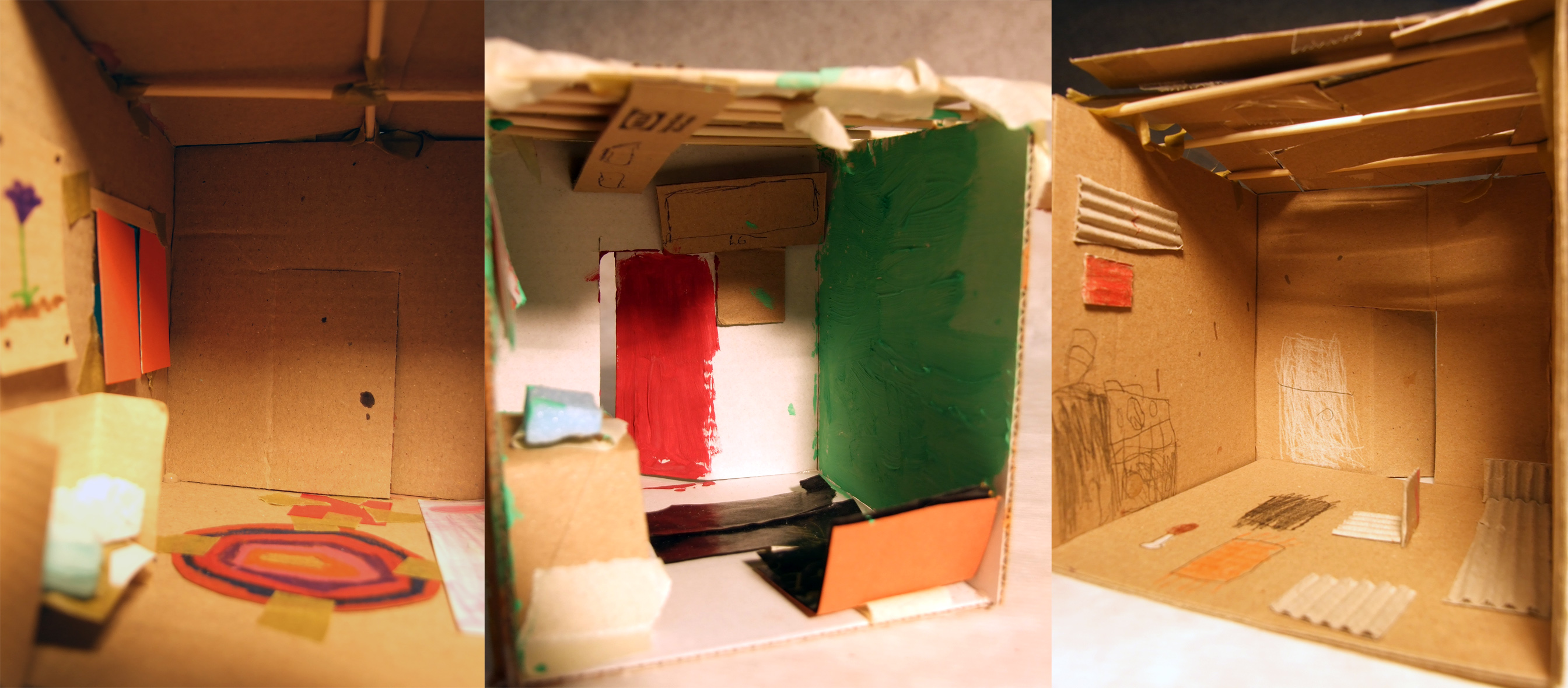 Supplies: cardbord house with only 3 walls (10x10x10 cm), bamboo sticks (11-12 cm), pieces of cardboard (2×8 cm), masking tape, paint, colored papers, any junk to design the house’s interior.