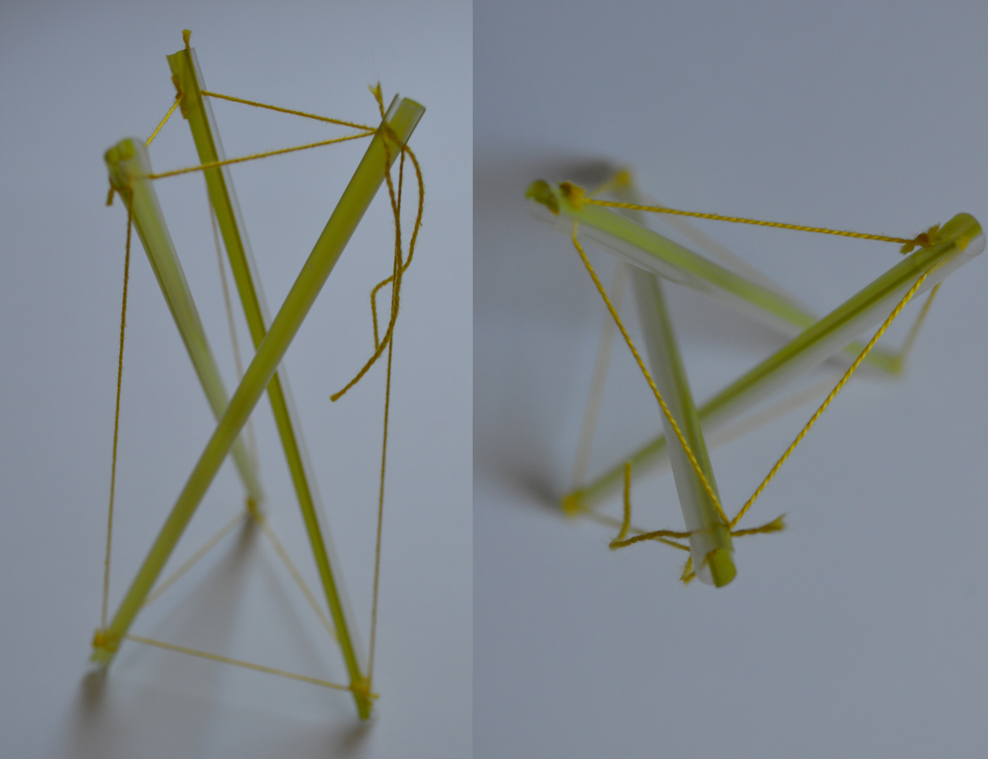 A szívószálak mindkét végét bevágjuk 1-1 cm hosszan. Az így kialakított hasítékba húzzuk bele a fonalat. Minden összekötés (huzal) egy-egy külön cérnadarab legyen, a cérnák túllógó végeit ne csomózzuk meg, mert miután minden alkatrész a helyére került, egyenként meg kell feszítenünk minden összekötést. Ha megfeszítettünk minden huzalt, végül megcsomózhatjuk/megragaszthatjuk az összes csomópontot.
