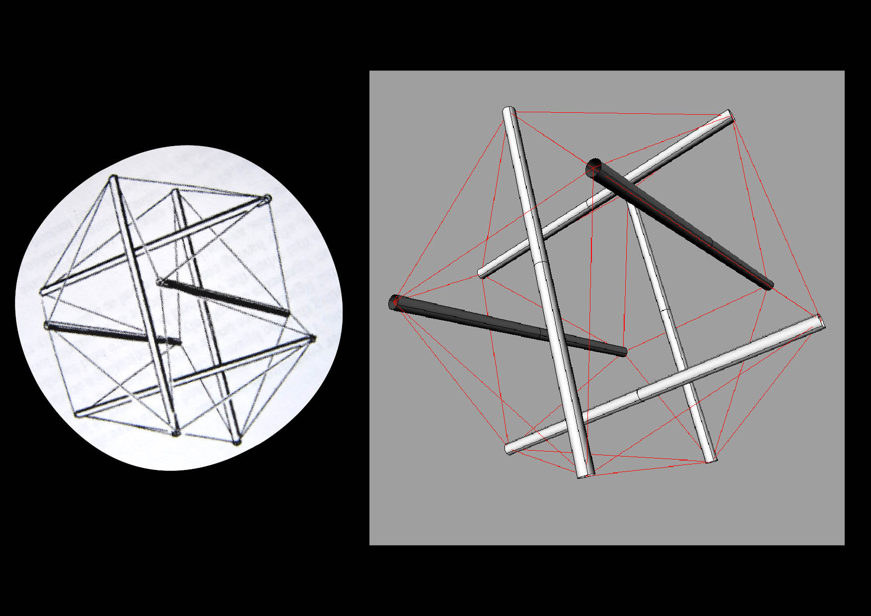 Feladat 2. A négy rúdból álló tensegrity már egy kicsit nehezebb feladvány. Bár a szerkesztési elve ugyanaz, mint a három rudasé, nagyobb koncentrációt, térlátást és kézügyességet igényel.