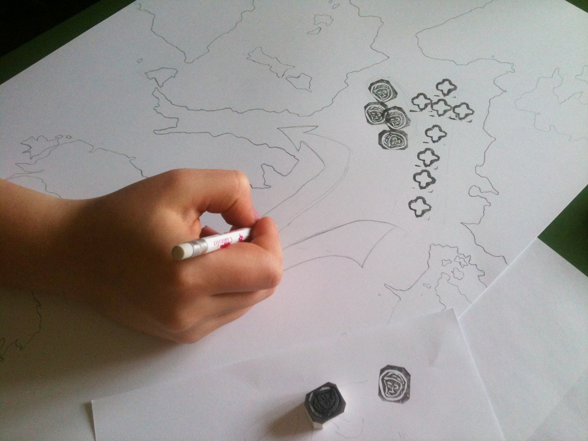 Anyag és eszközszükséglet: kinyomtatott lapok, csapatonként 1-1 radír és sniccer a nyomdakészítéshez, min. A2-es fehér papír és ceruza/filctoll a közös térkép elkészítéséhez. Vízbázisú, sötét, széles filctoll vagy nyomdapárna a nyomdázáshoz.