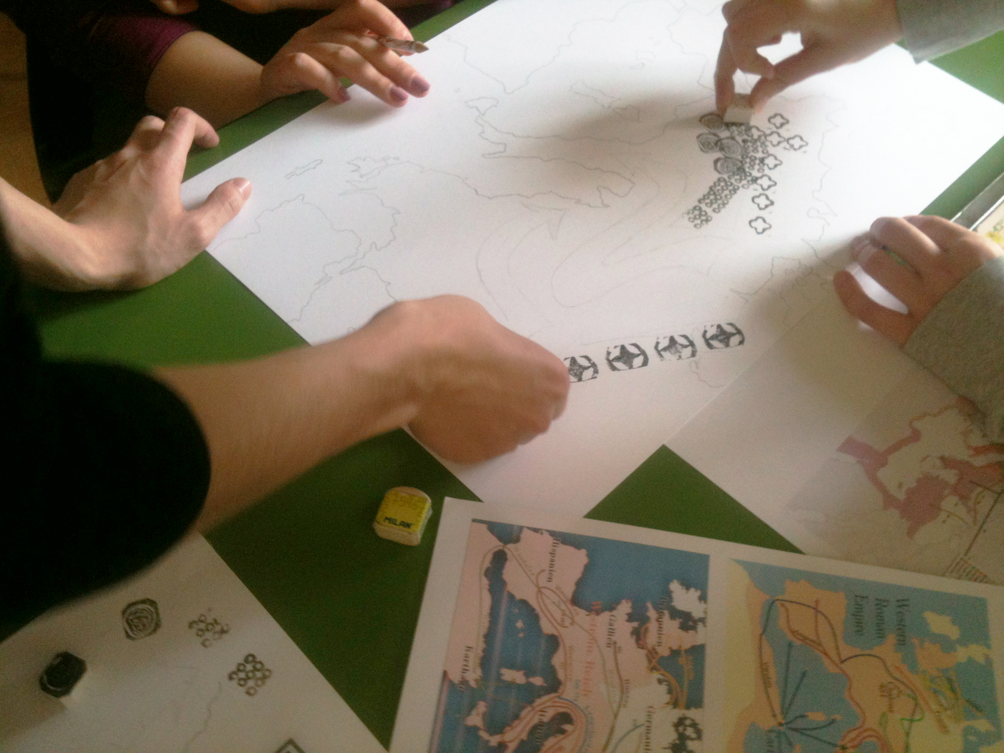 – két vagy három diák vállalkozzon arra, hogy térképet készít és tanulmányozza a népek útvonalait, ők kapnak kinyomtatott térképeket kiindulási alapként. Lehet közte mai térkép is, az sem baj, ha idegen nyelvű, különböző jeleket tartalmazó forrásaink vannak. Minél többet gondolkodnak a térképek összerajzolásán, szintetizálásán, annál jobb.