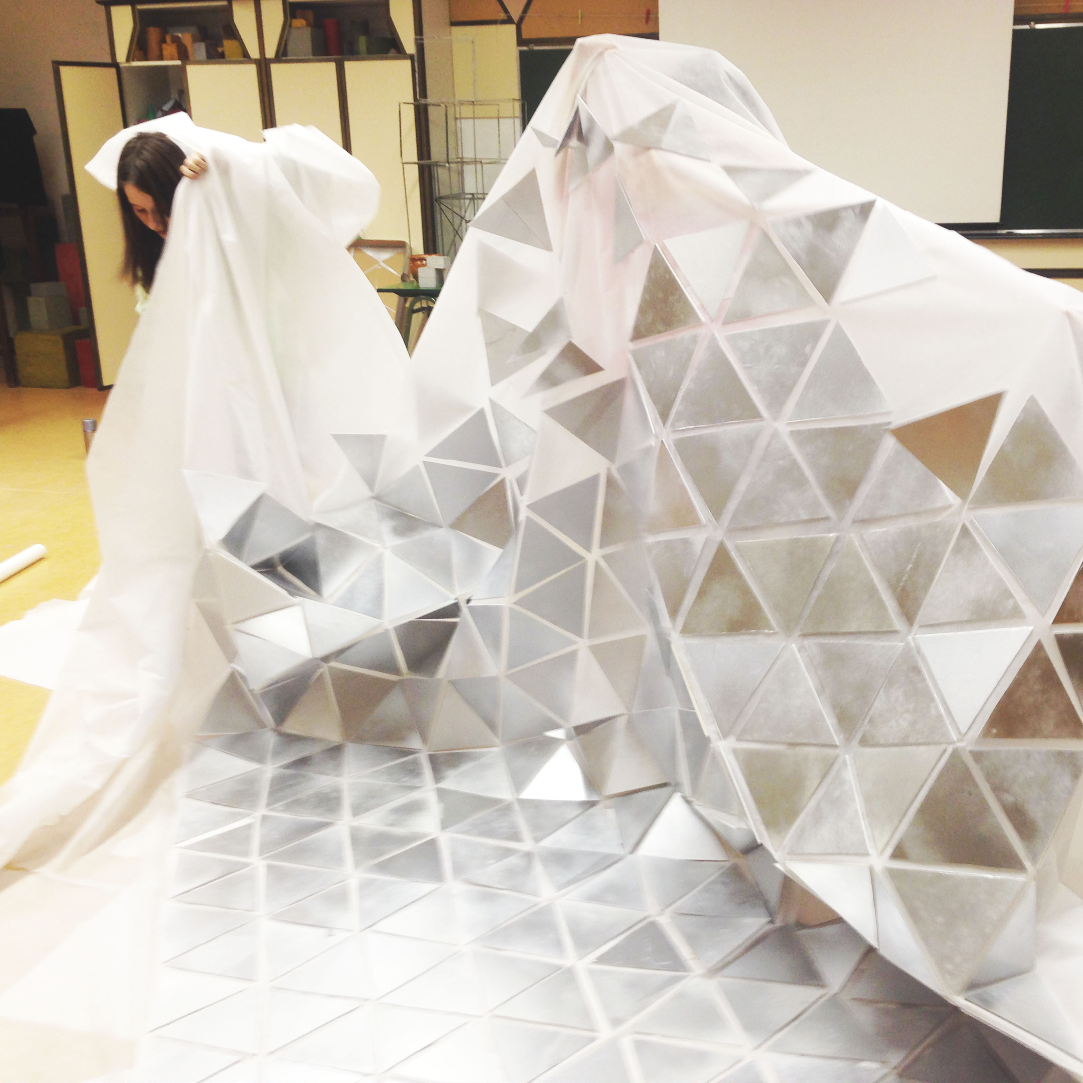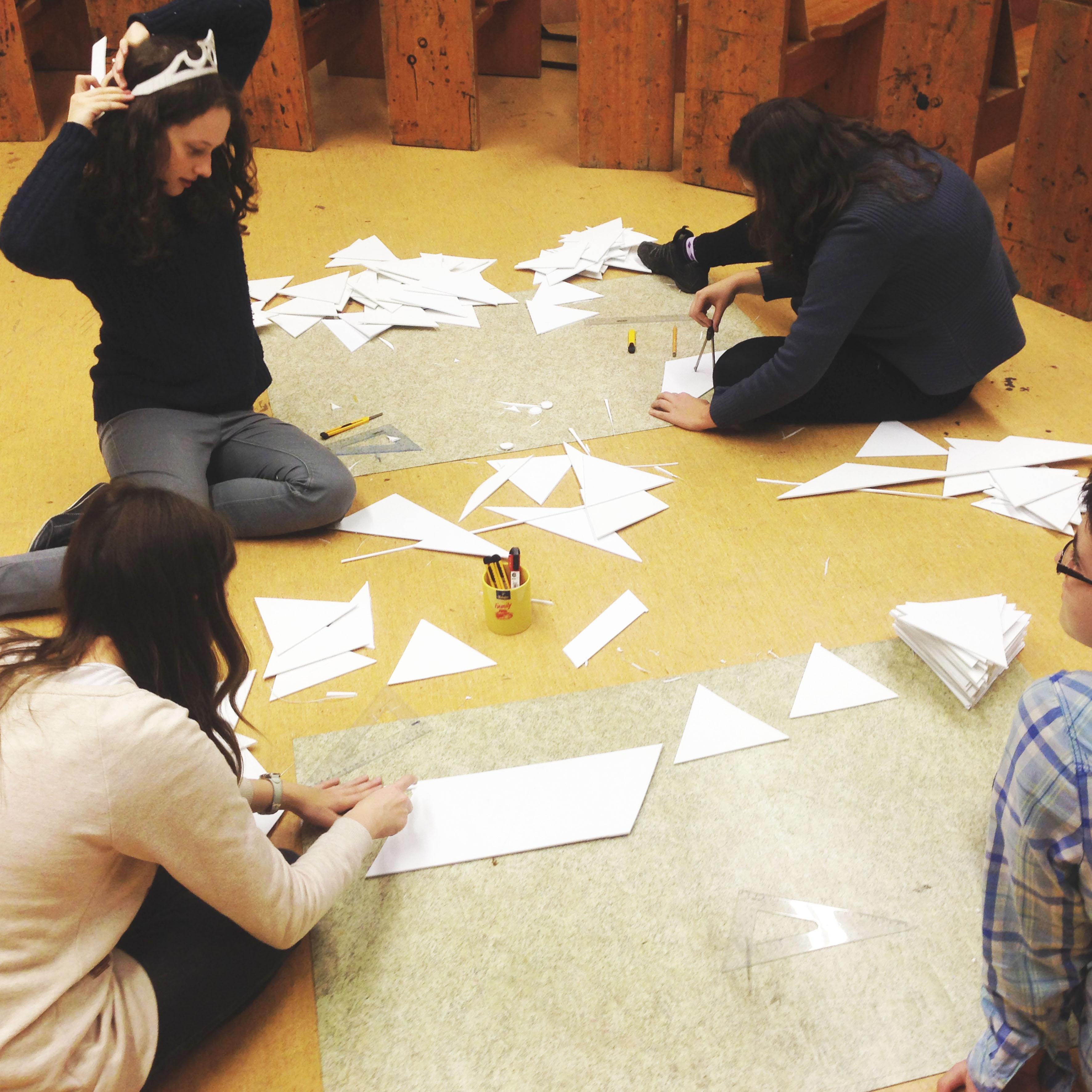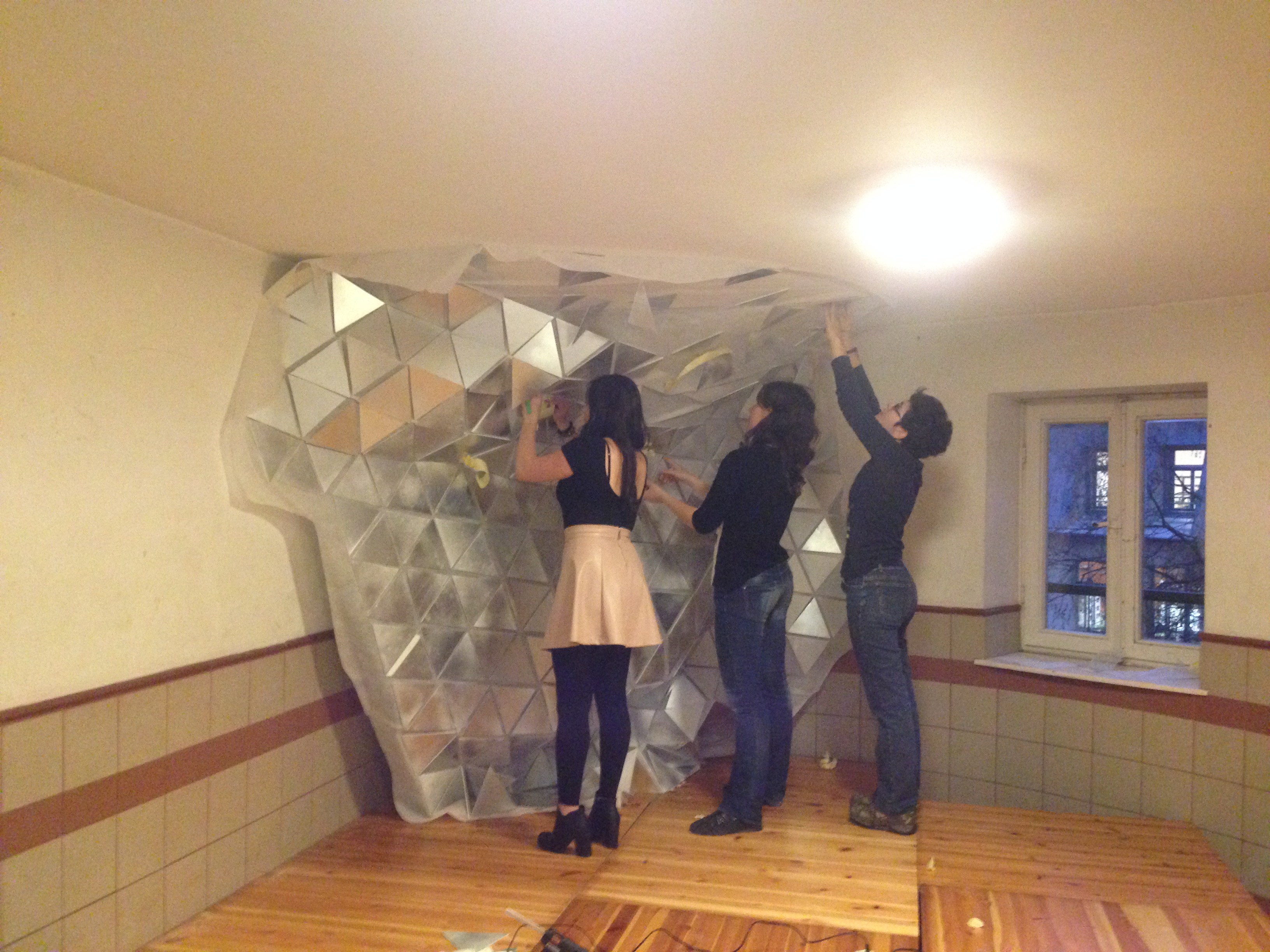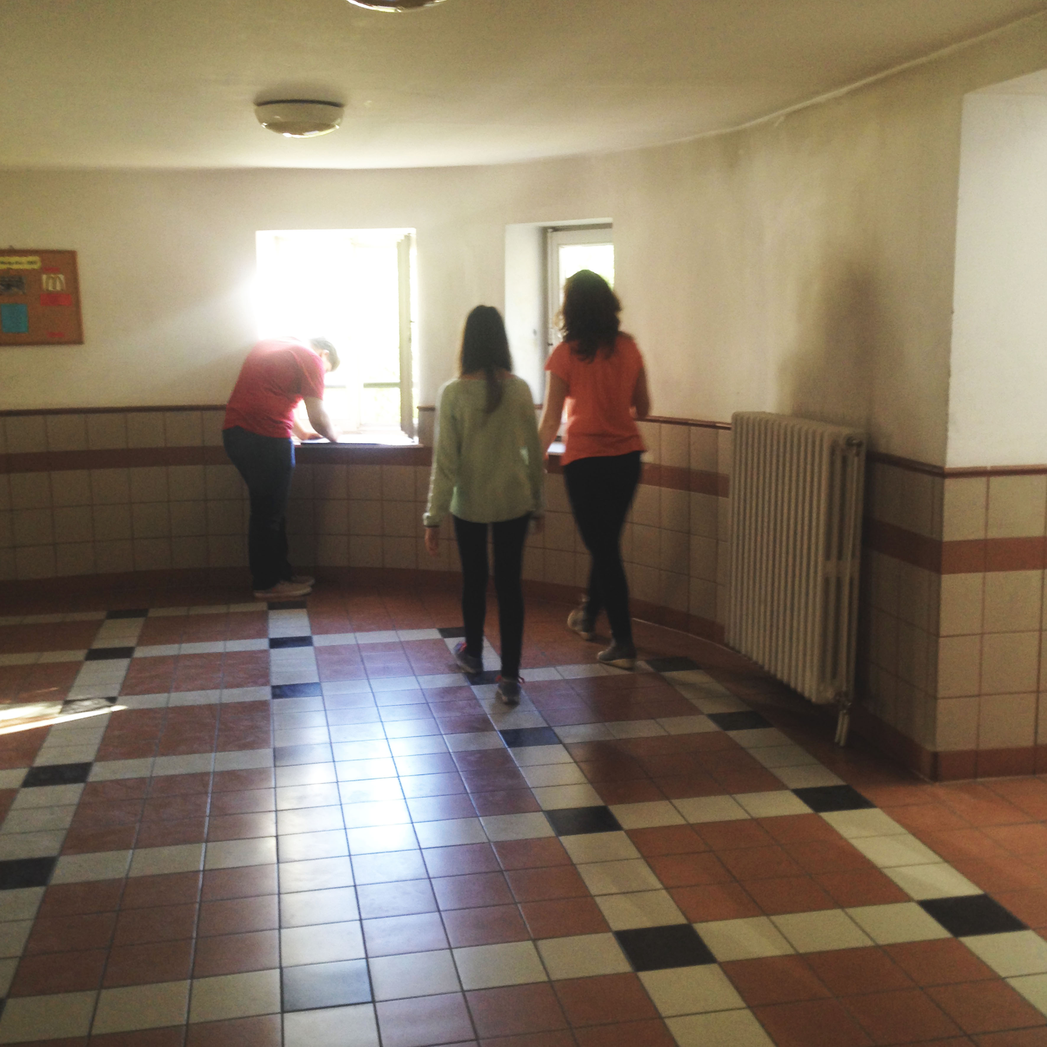 Kiszemeltük a helyszínt, felmértük, közvéleményt kutattunk, problémát fogalmaztunk, ötleteltünk, felhasználható anyagokat kerestünk, kísérleteztünk. Majd mikor megvolt a végleges tervünk, összeszedegettünk hozzá anyagokat, mint például néhány használaton kívüli dobogó a rajzteremből, a diplomakiállításom habkartonja (mint mondták, legalább lett valami haszna is… ;) ), nálam otthon elfekvő festékszóró spray és textília, valamint saját zsebből a legeslegolcsóbb padlófilc.