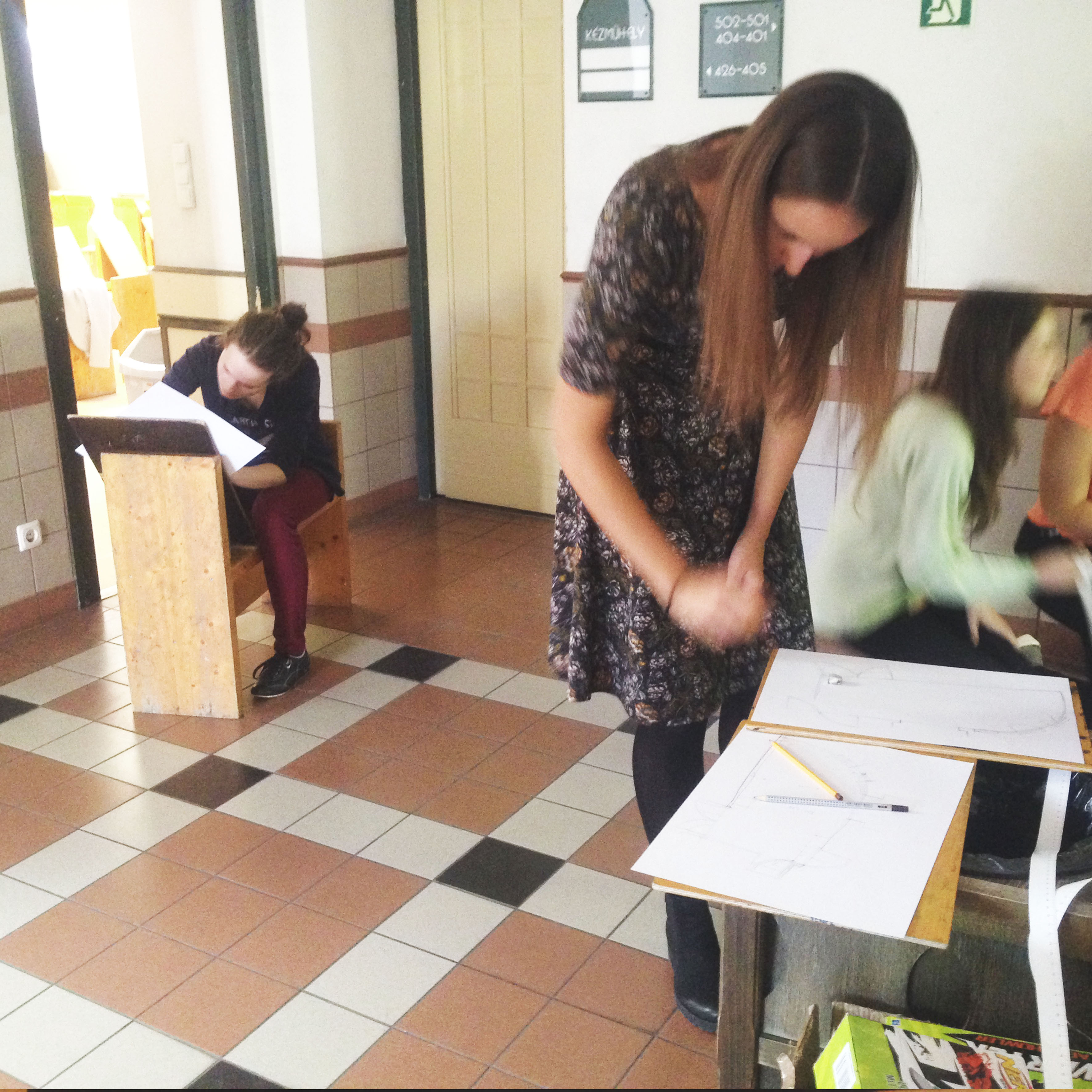 Tanév elején vágtunk bele a munkába. Előző évben a Design Szakkör nevű formációval diákpályázatokon indultunk, de ez két félév alatt unalmassá vált, és szerettem volna a diákjaimat olyan kihívások elé állítani, ahol valódi tereket formálhatnak, és a téralakítás hatását saját bőrükön meg is tapasztalhatják. Először gyakorlásképp a rajzterem előtti üres területet alakítottuk át. A design-szemlélet vagy design-thinking módszertanát alkalmaztuk. Ennek iskolai alkalmazásáról a következő posztomban írok.