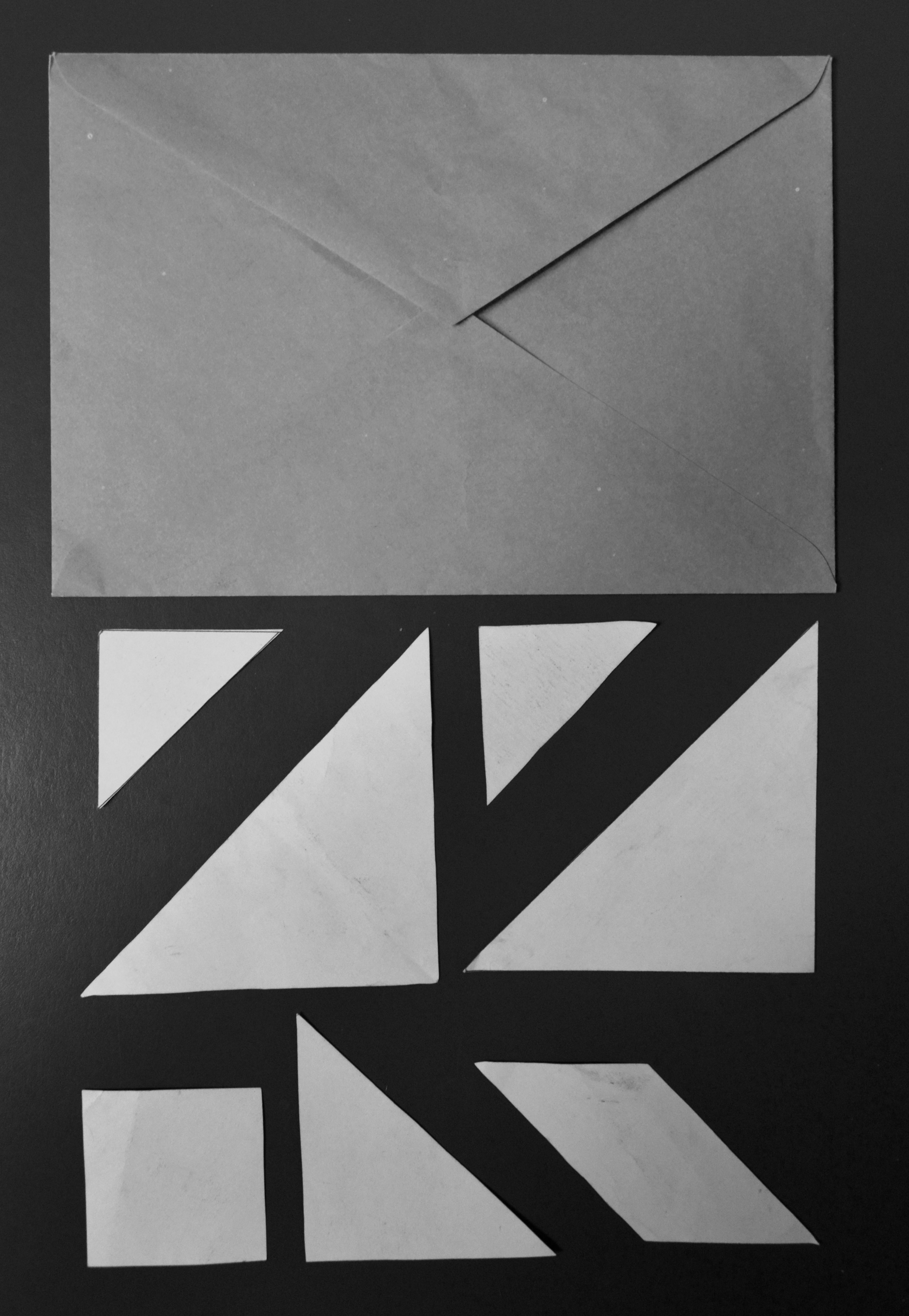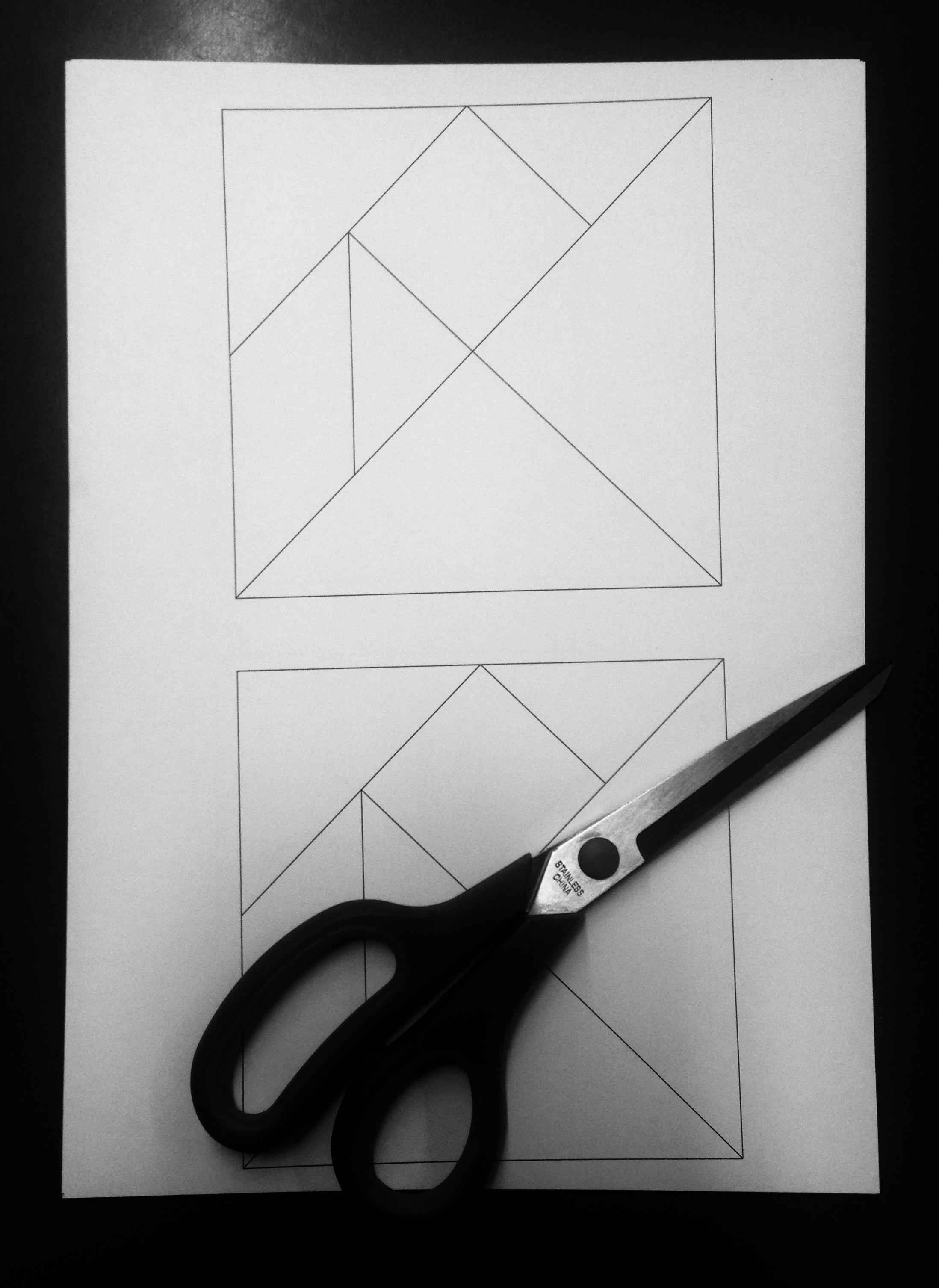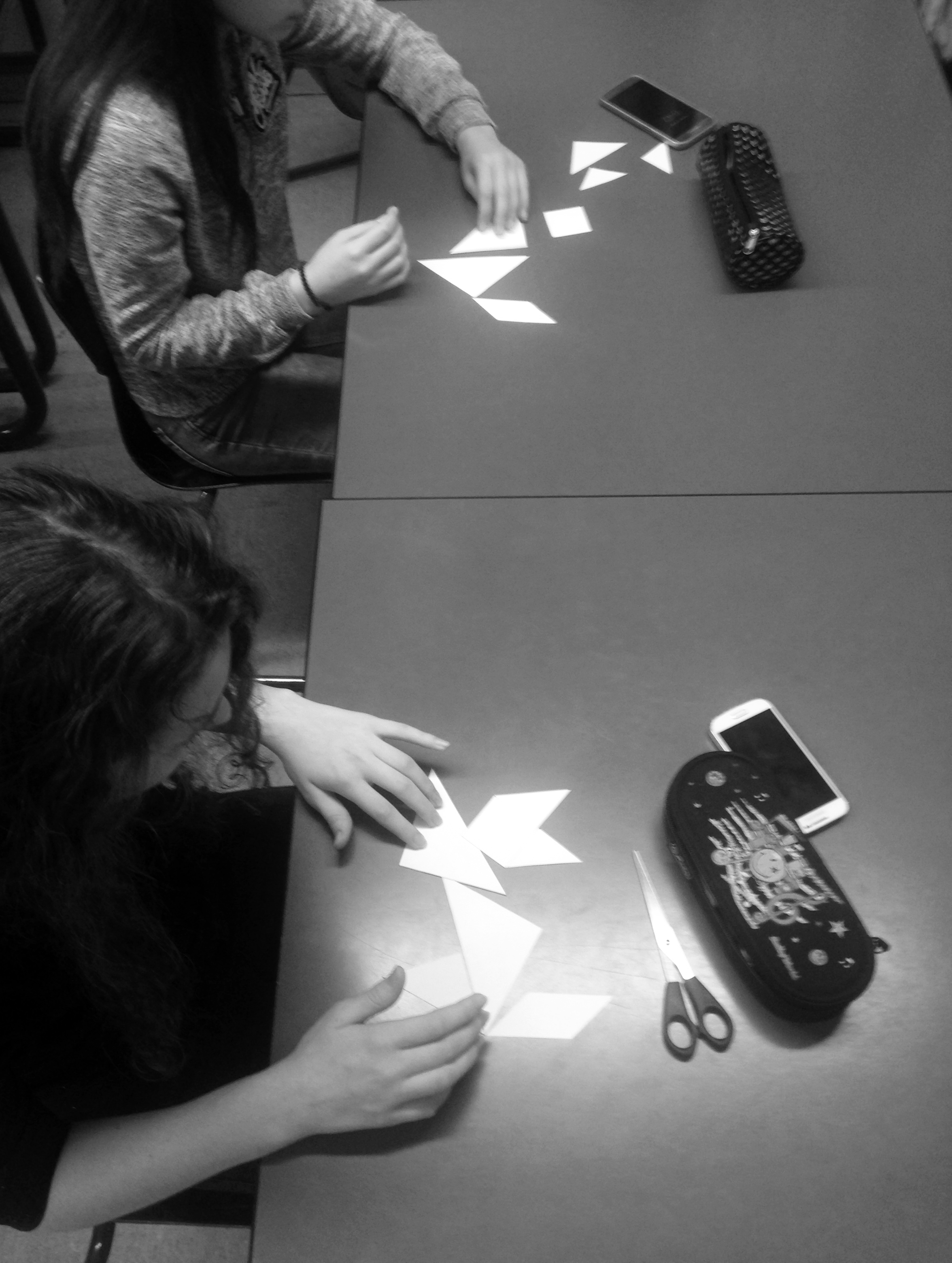 At the beginning of class, I’ll hand out the tangrams printed on the A4 sheet, scissors for each students, and envelopes. (or tangram sets)