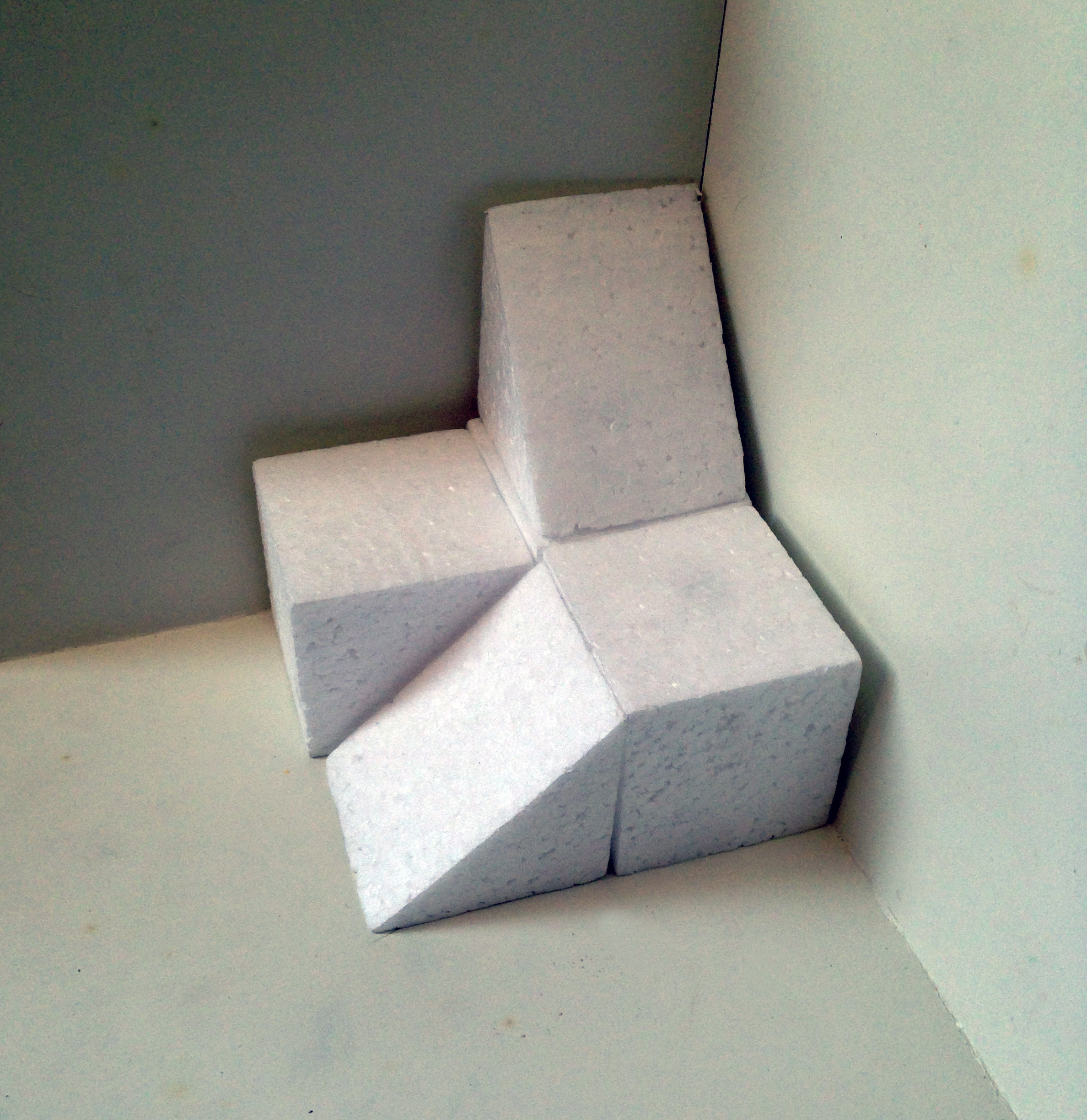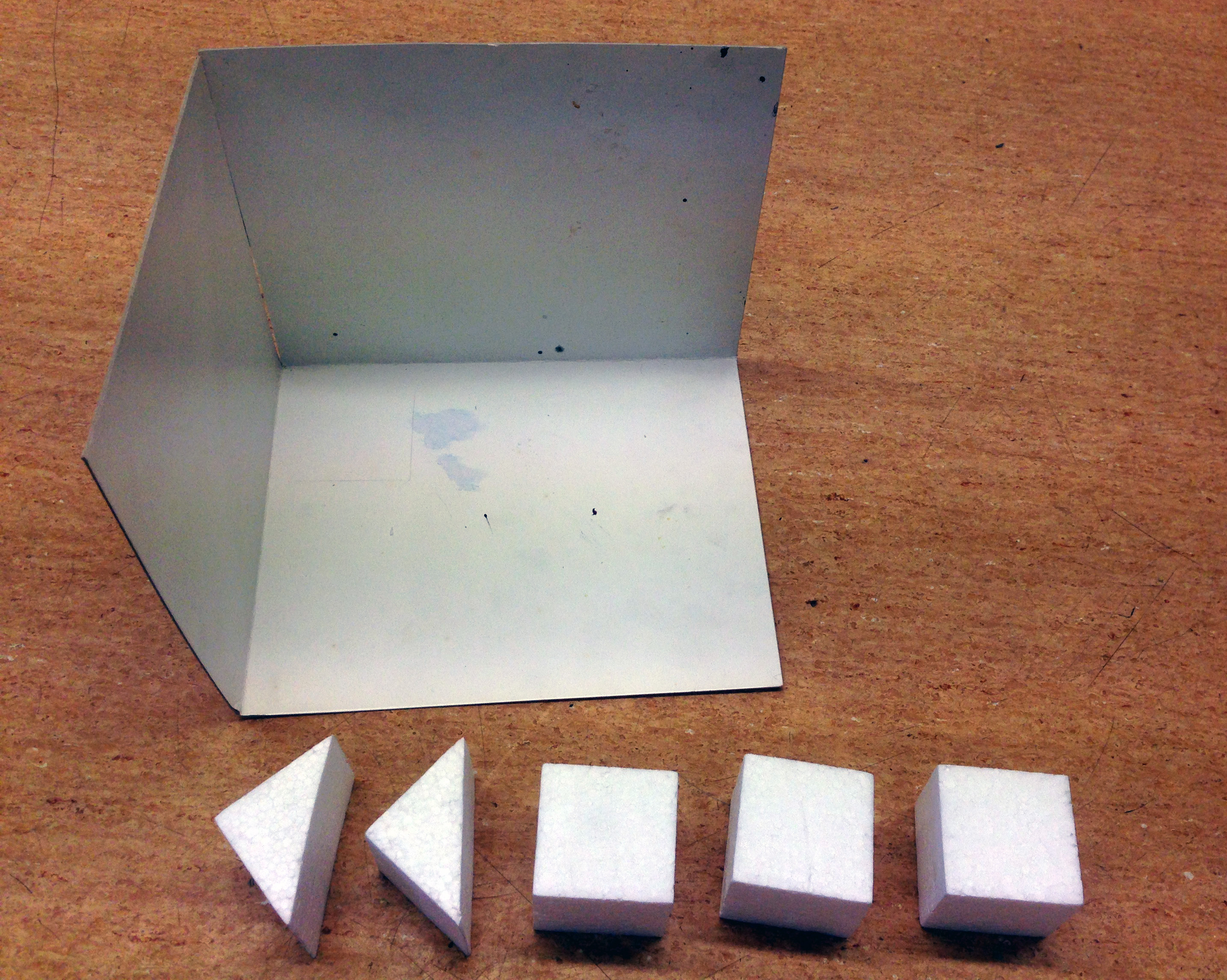 Supplies: cardboard corners and building blocks (I made the blocks of Styrofoam, but any type of cube+triangular prism is good) for all pairs, paper, pencil
