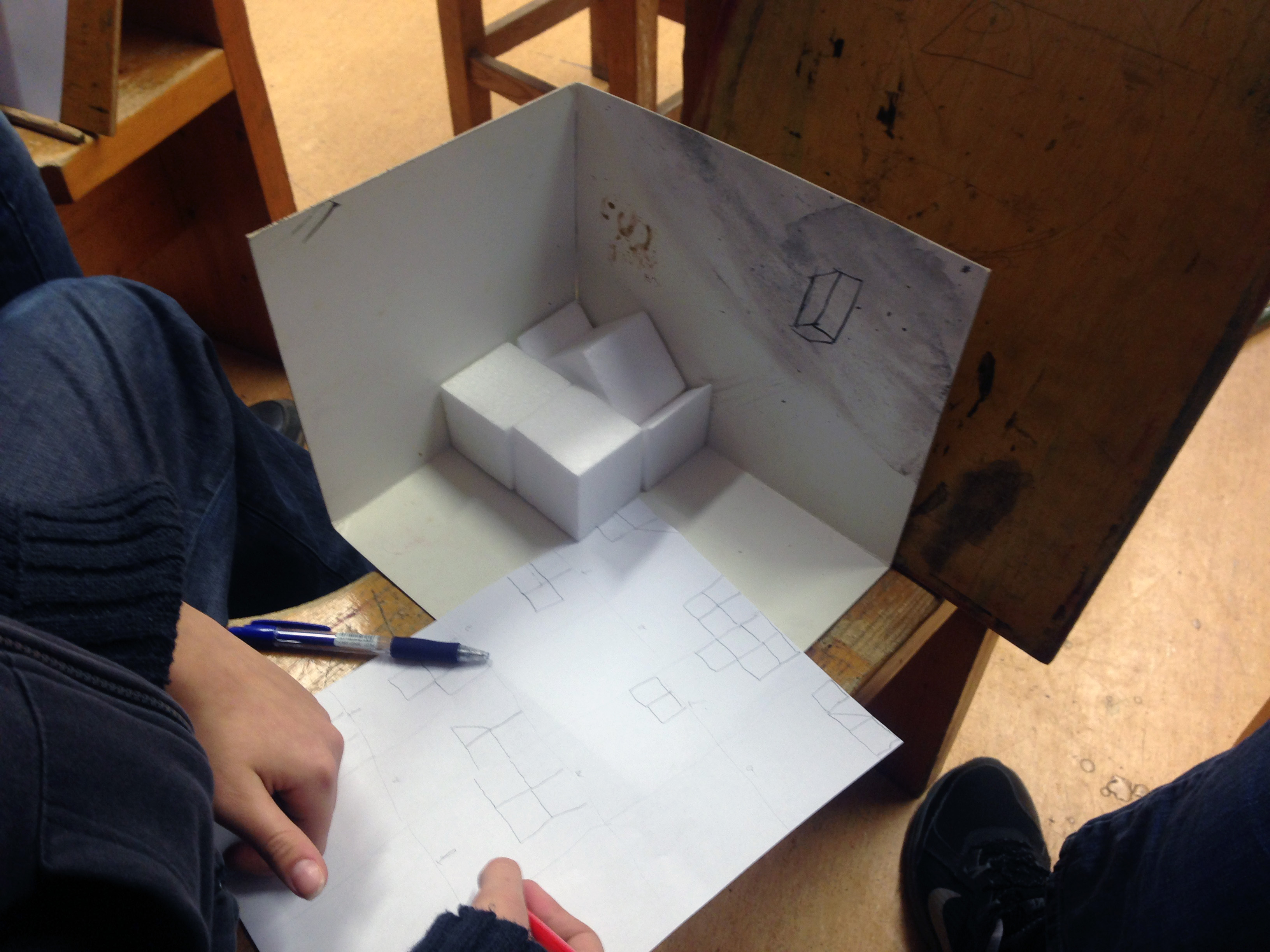 Topic: Building a simple composition using building blocks into a cardboard corner, creating and reconstructing three elevation views.