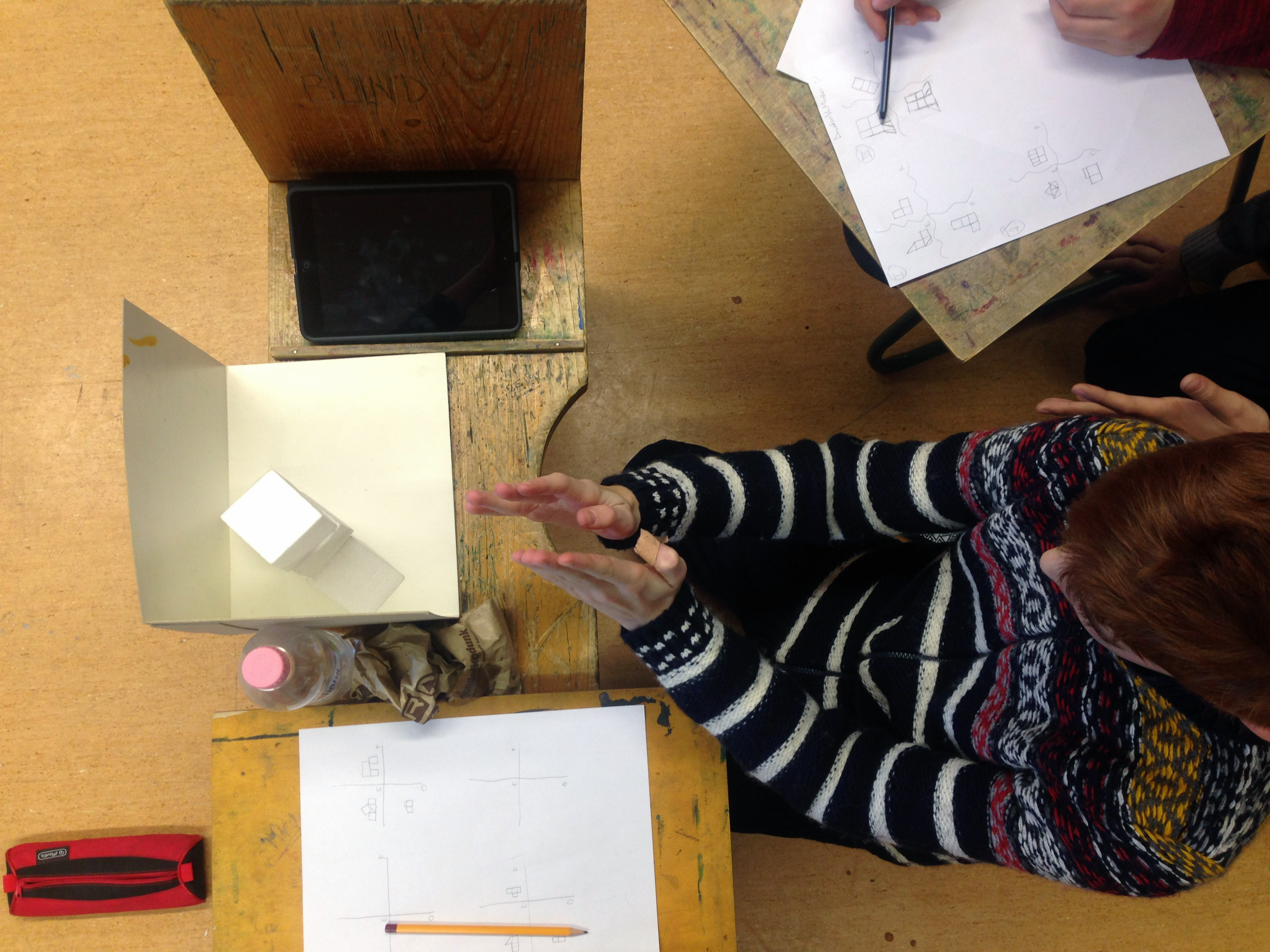 I think, on one hand this is a bit boring, and on the other hand involves too many transformations: we’re looking at a 2D image made based on 3D, we have to imagine it in 3D, and have to draw it without modeling, in 2D. That’s why I wanted a task that only exercises the 2D-3D transformation.