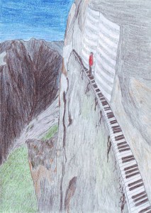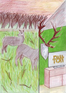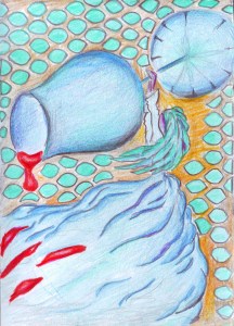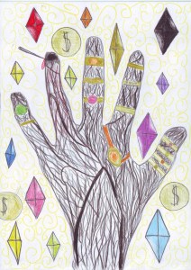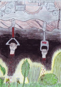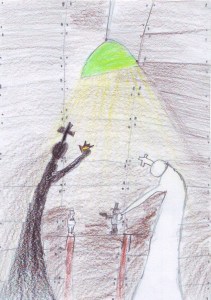 A harmadik óra elején lezártuk az ötletbörzét, kértem, hogy óra végére legyen kész a vázlat, utána már ne változtassanak rajta. A kompozíció, mint téma erősen jelen volt egész órán, kompozíciós sémákat rajzoltam a táblára, beszélgettünk dinamikáról, statikusságról, szimmetriáról és asszimetriáról.
