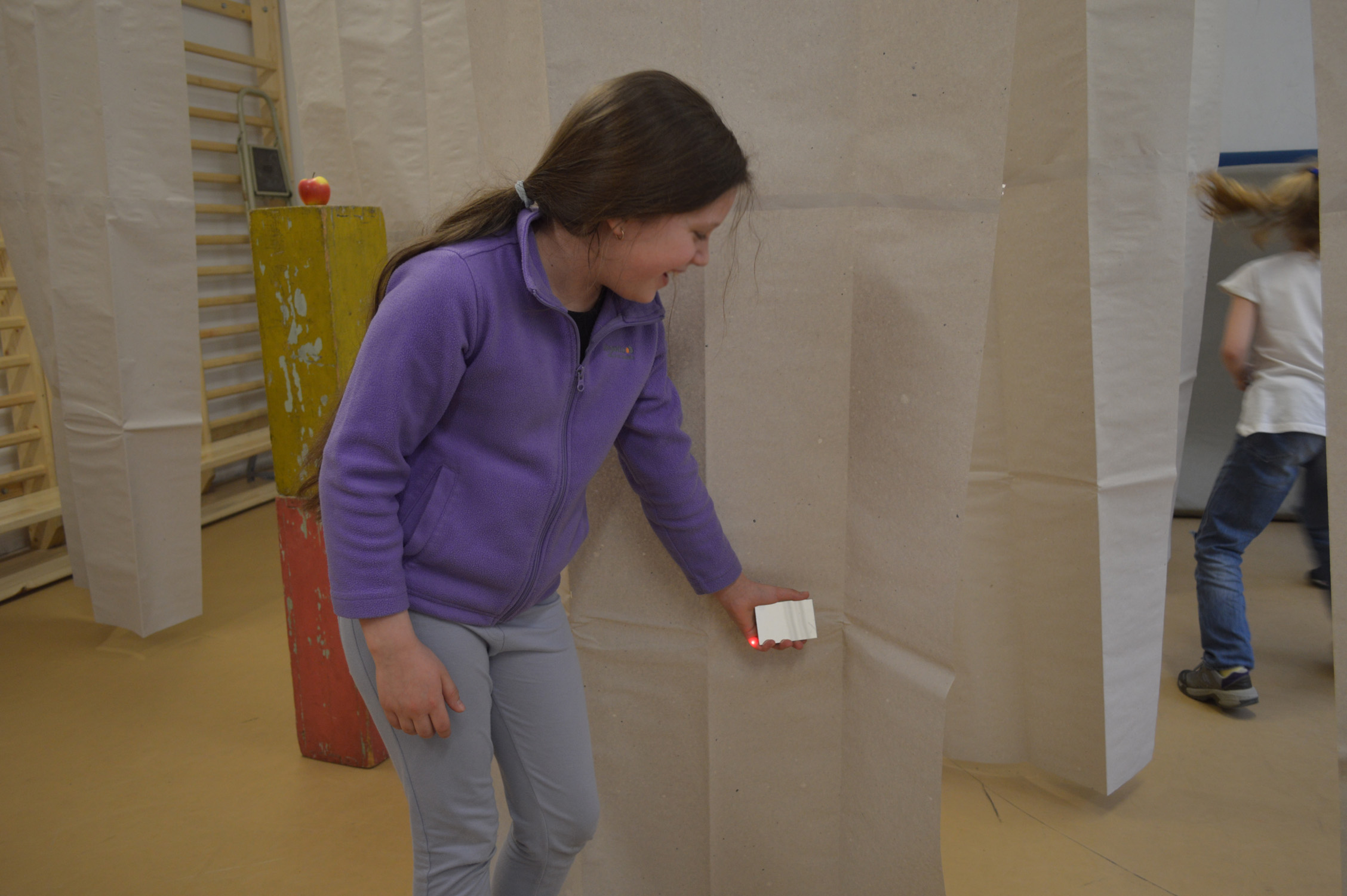 A harmadik, legnehezebb részre egy olyan labirintust építettem belógatott csomagolópapírokból, ami már igazán igénybe veszi téri orientációs képességünket, memóriánkat és képzeletünket.