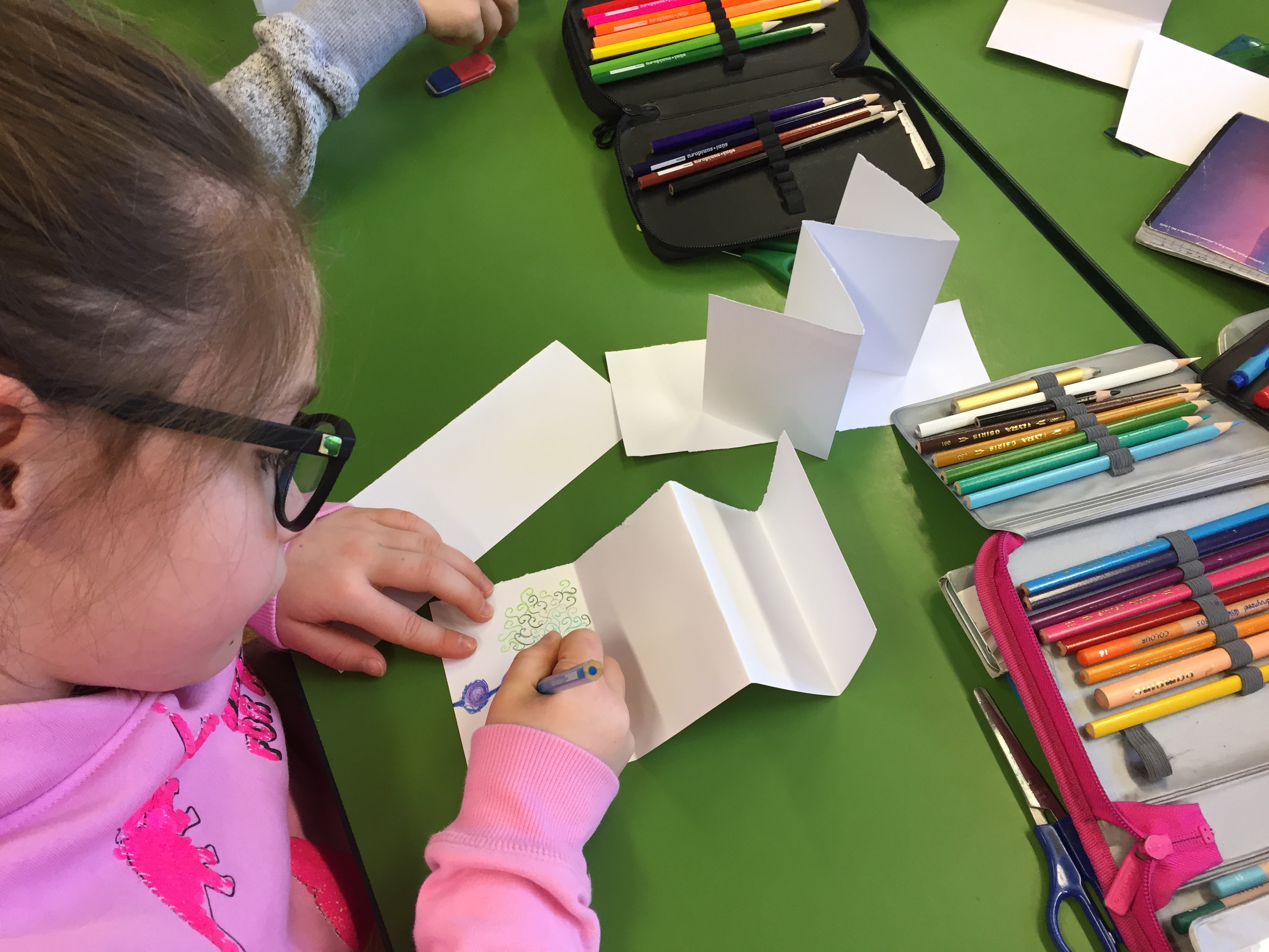 Here we worked with A3 pages, but it works well with A4, except it requires more meticulous work. I drew a pattern on the board which the children broadly followed, but it was possible to differ from it. We had to make sure there were no two notches against each other.