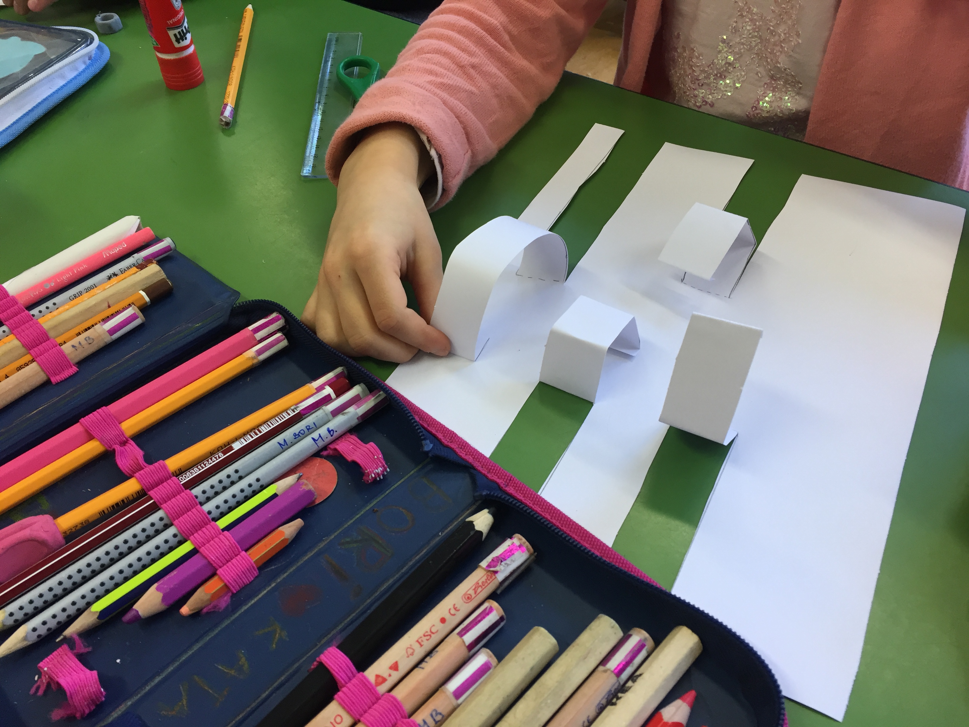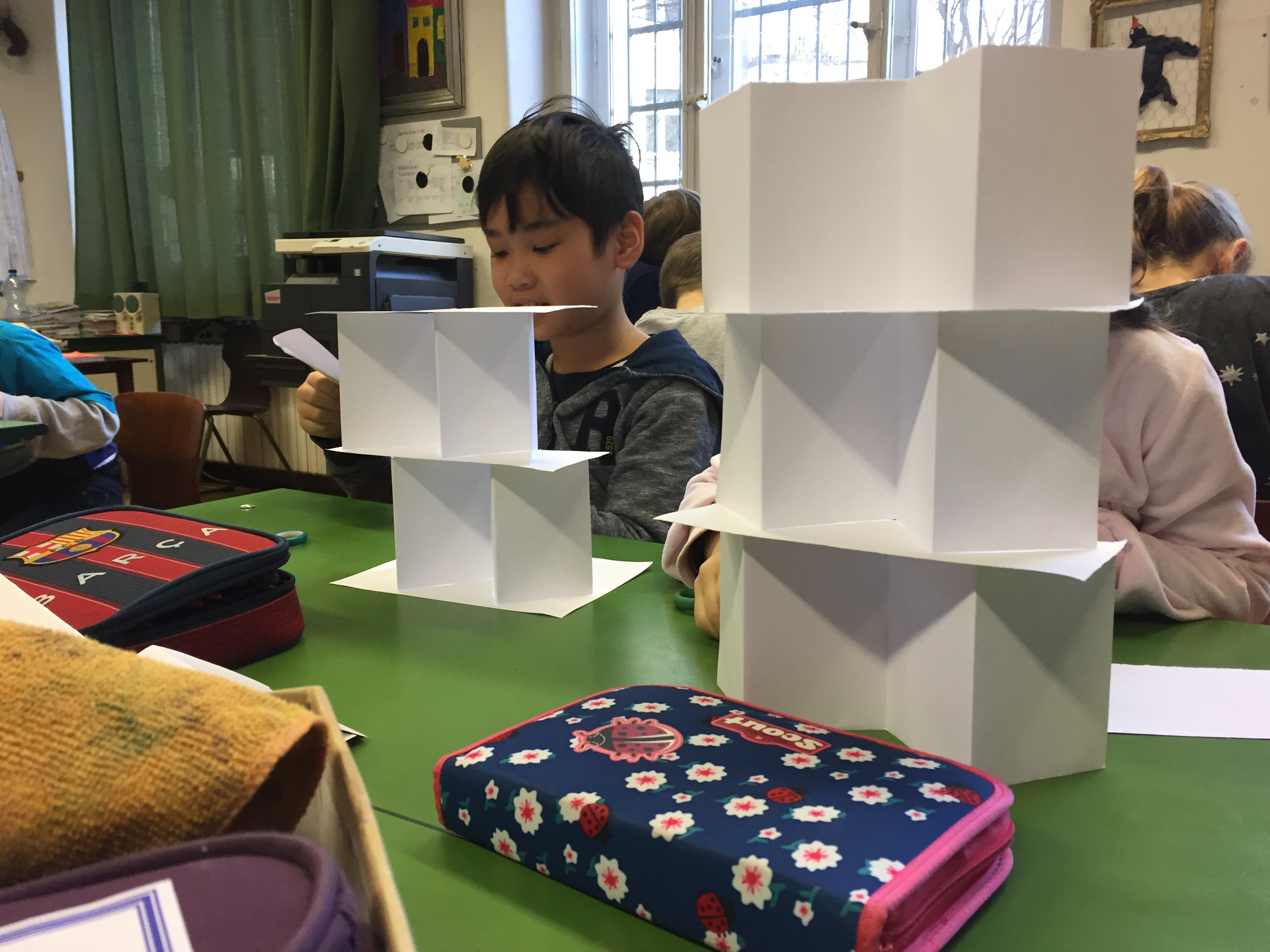 We did the task “Robber Weasels’ treasure chamber“, with fourth graders working with A3 paper, which the children split into four parts and then formed a hollow prism from it.