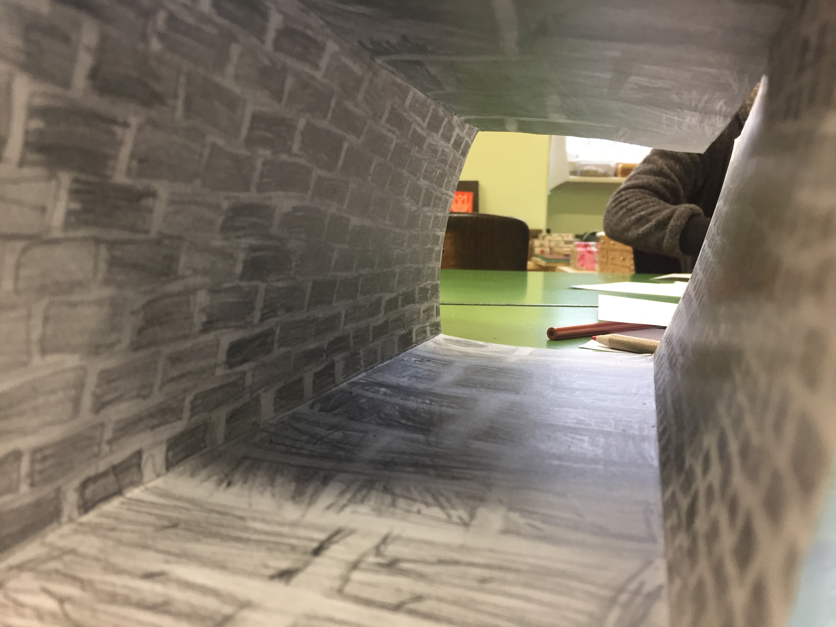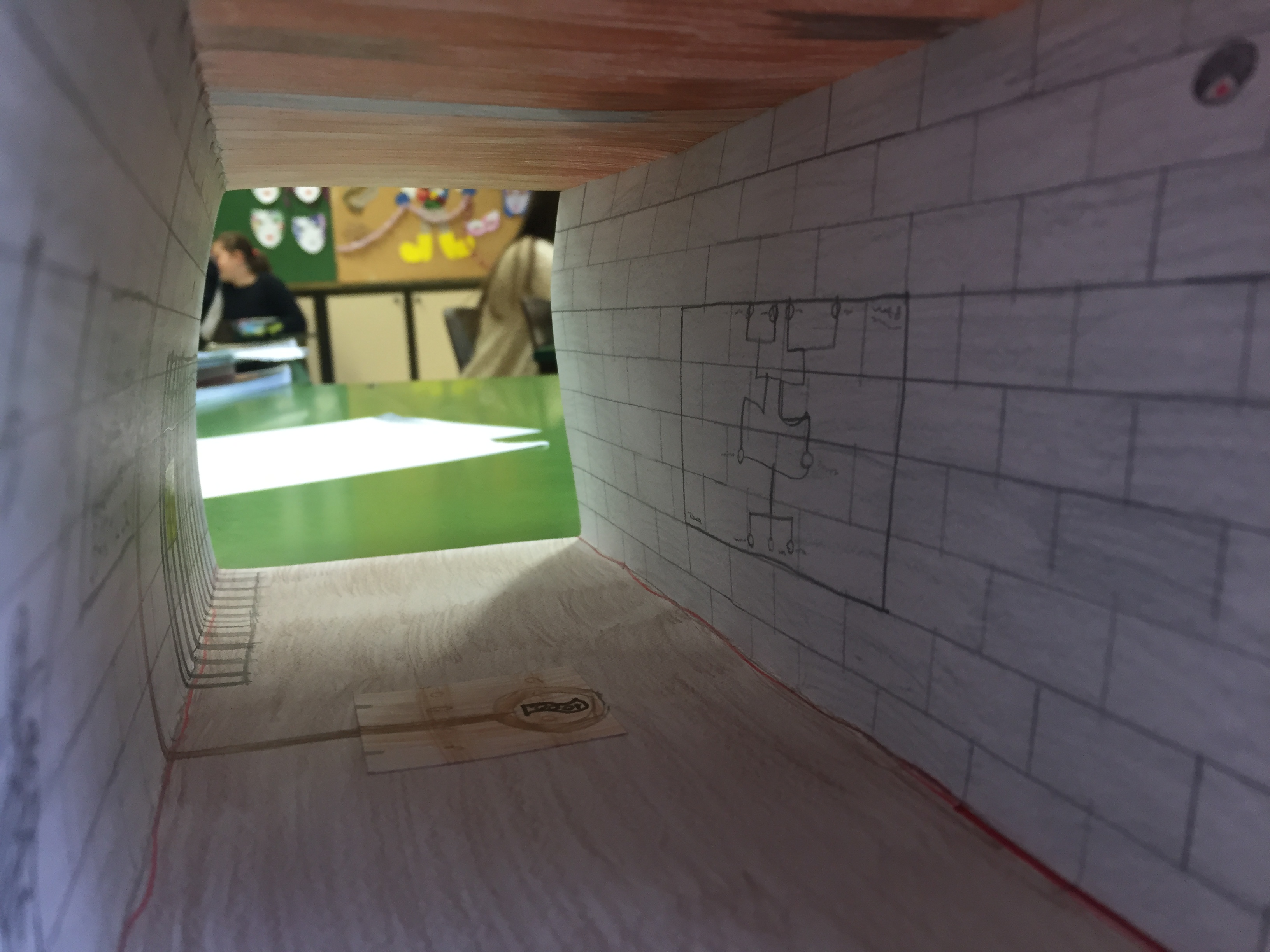 The bottom of the prism represented the floor, the two sides represented the two walls, and the top was the ceiling. Since the kids I worked with were older (4th grade), the material-like depiction came into focus. As an introduction, we observed the cladding of our surroundings and looked at some textures on the projector: cellar, cave, prison – mossy stone wall, damp floor, rotten wooden door, rusty iron grille, etc.