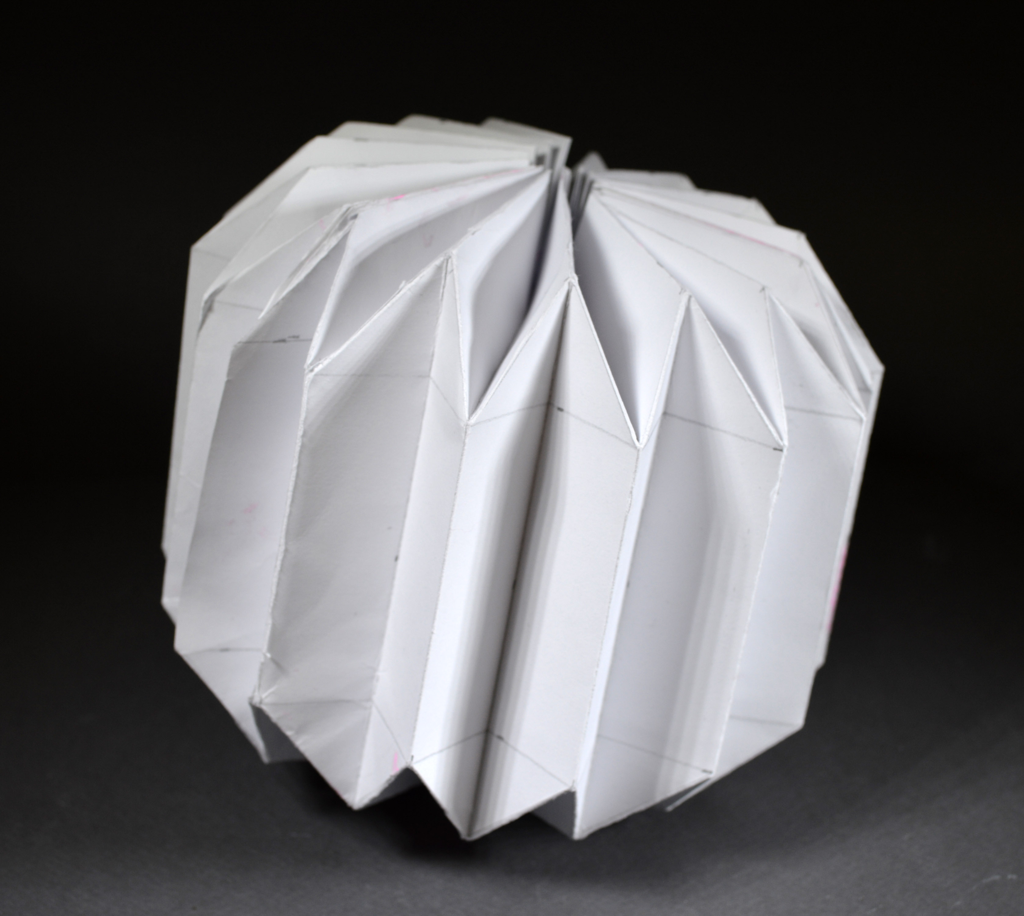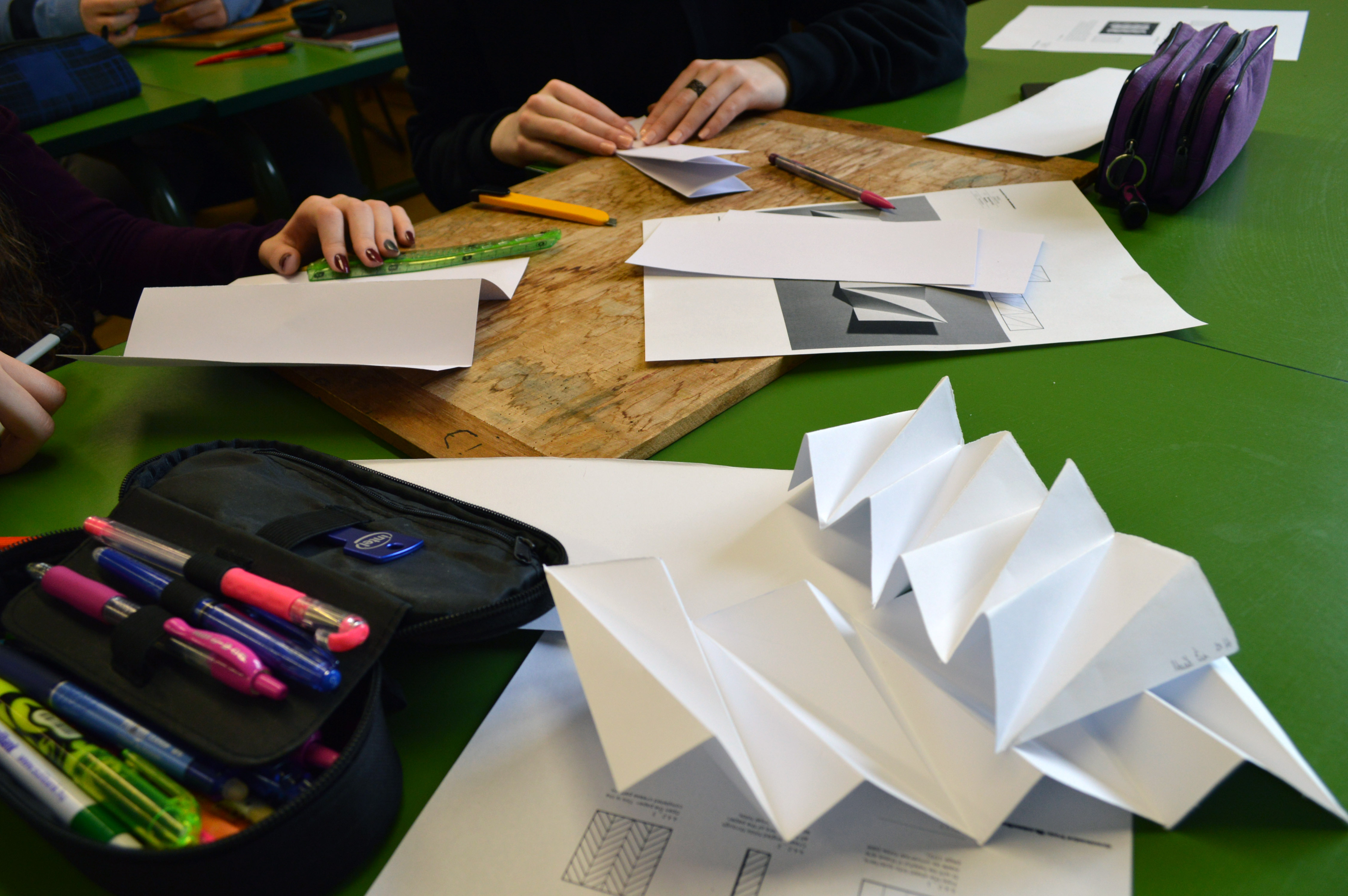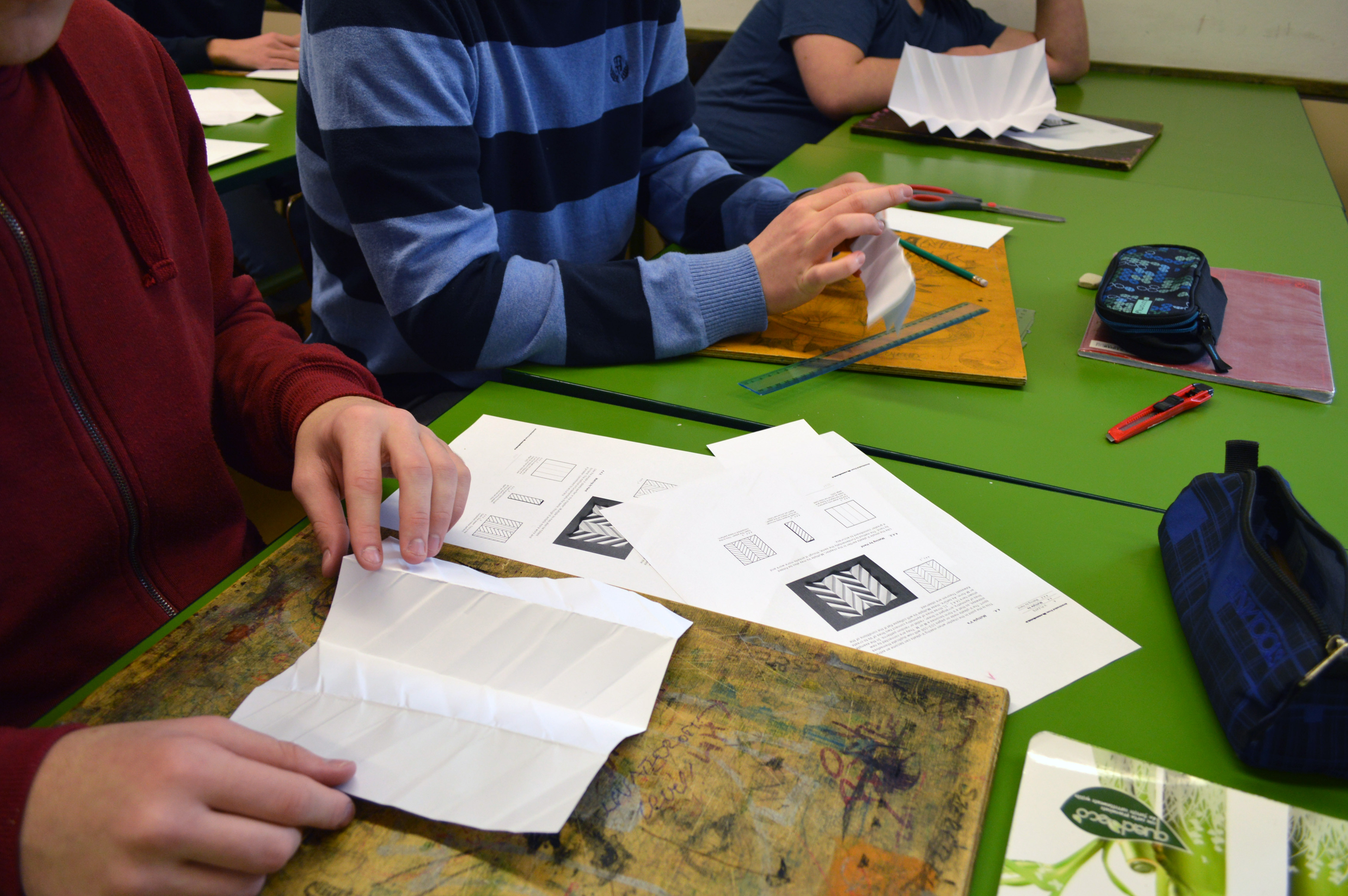 The second two classes were left for the folding of the final lampshade. The students using their direct experience, as well as applying and further developing patterns they saw their peers use, created a lampshade, with the shape and size that fits around a traditional socket, with a LED bulb inside. For this size, we needed an A2 technical drawing sheet, it was fantastic to see the plane transform into a large spatial shape in their hands!