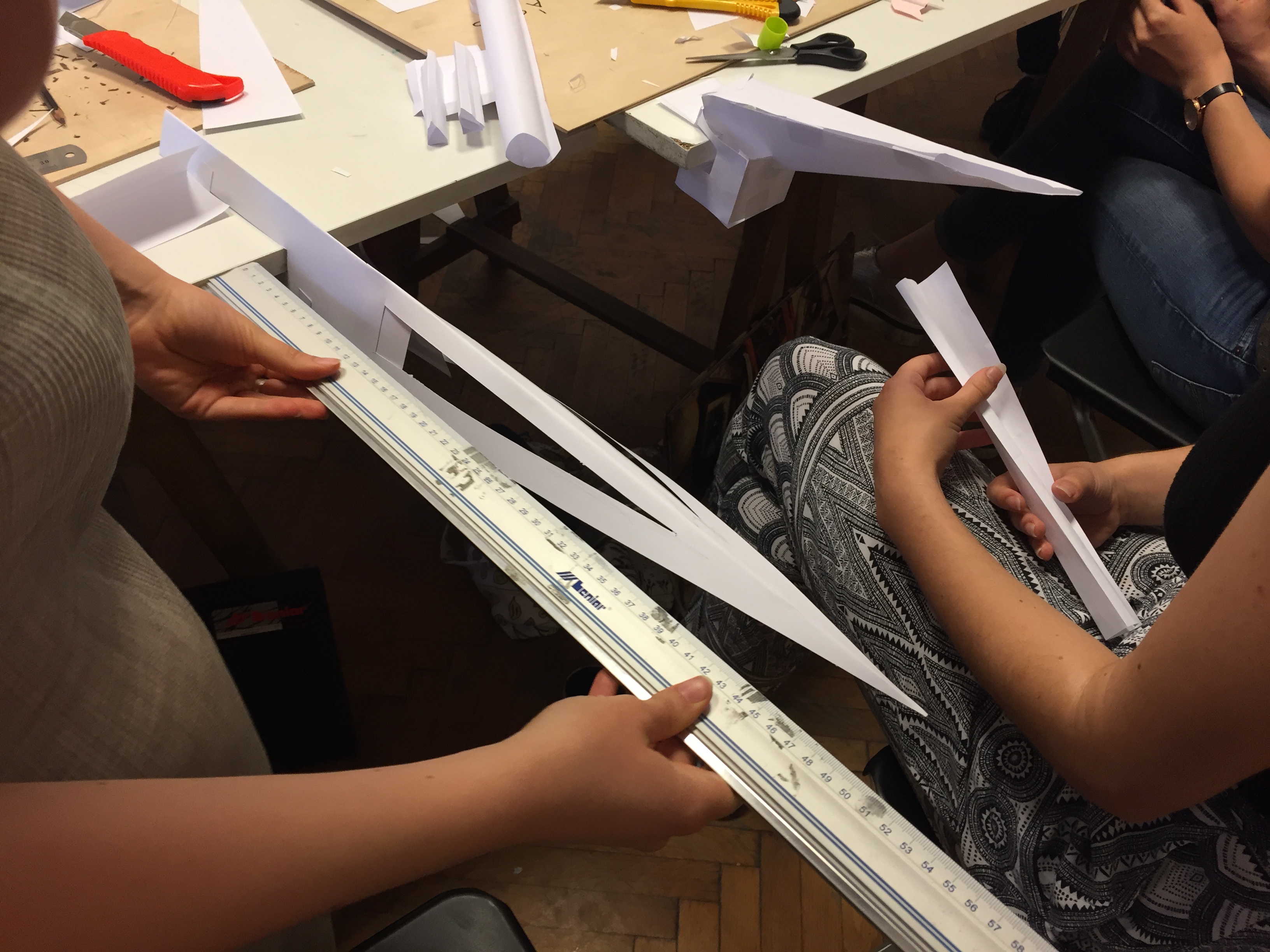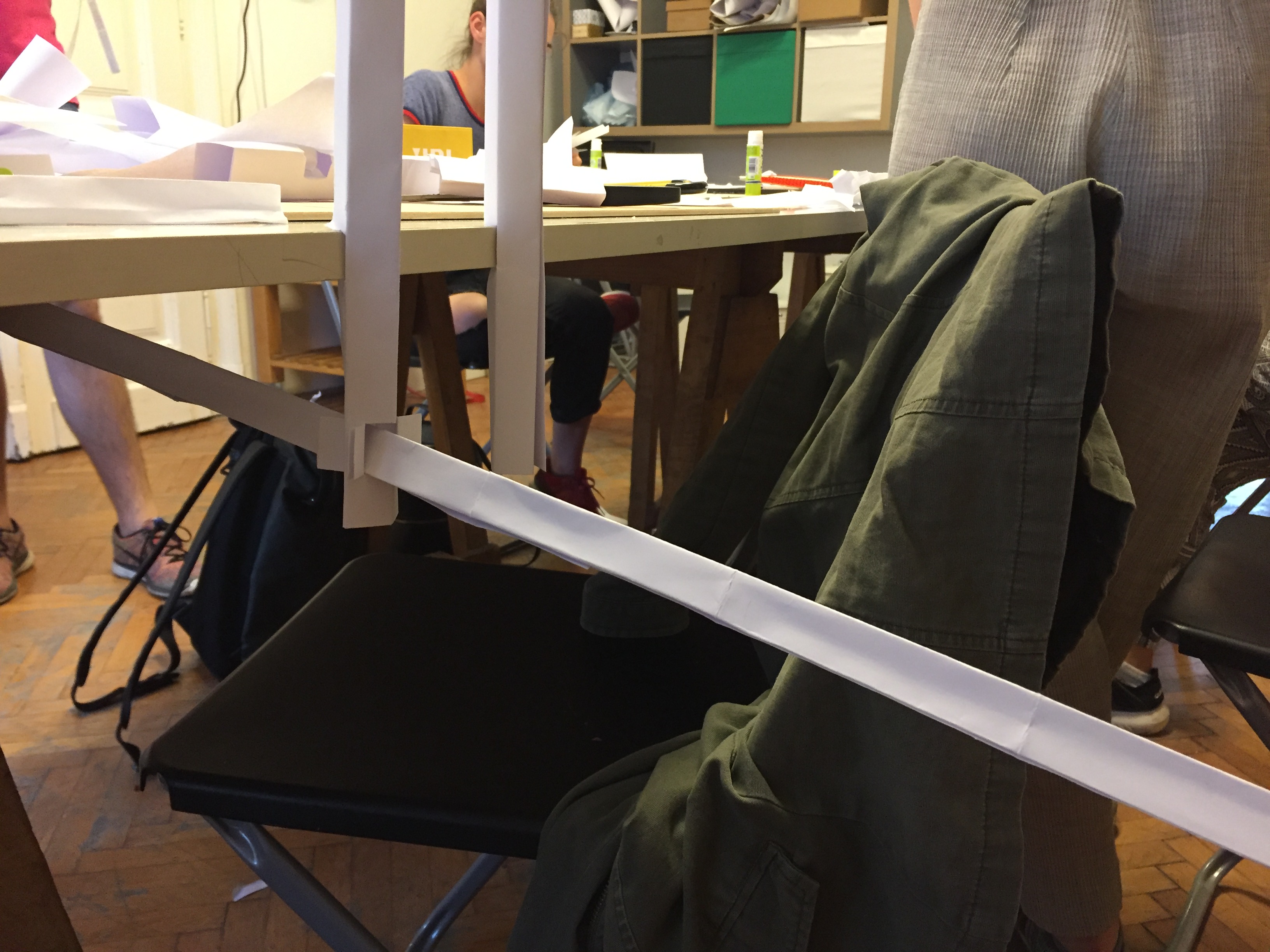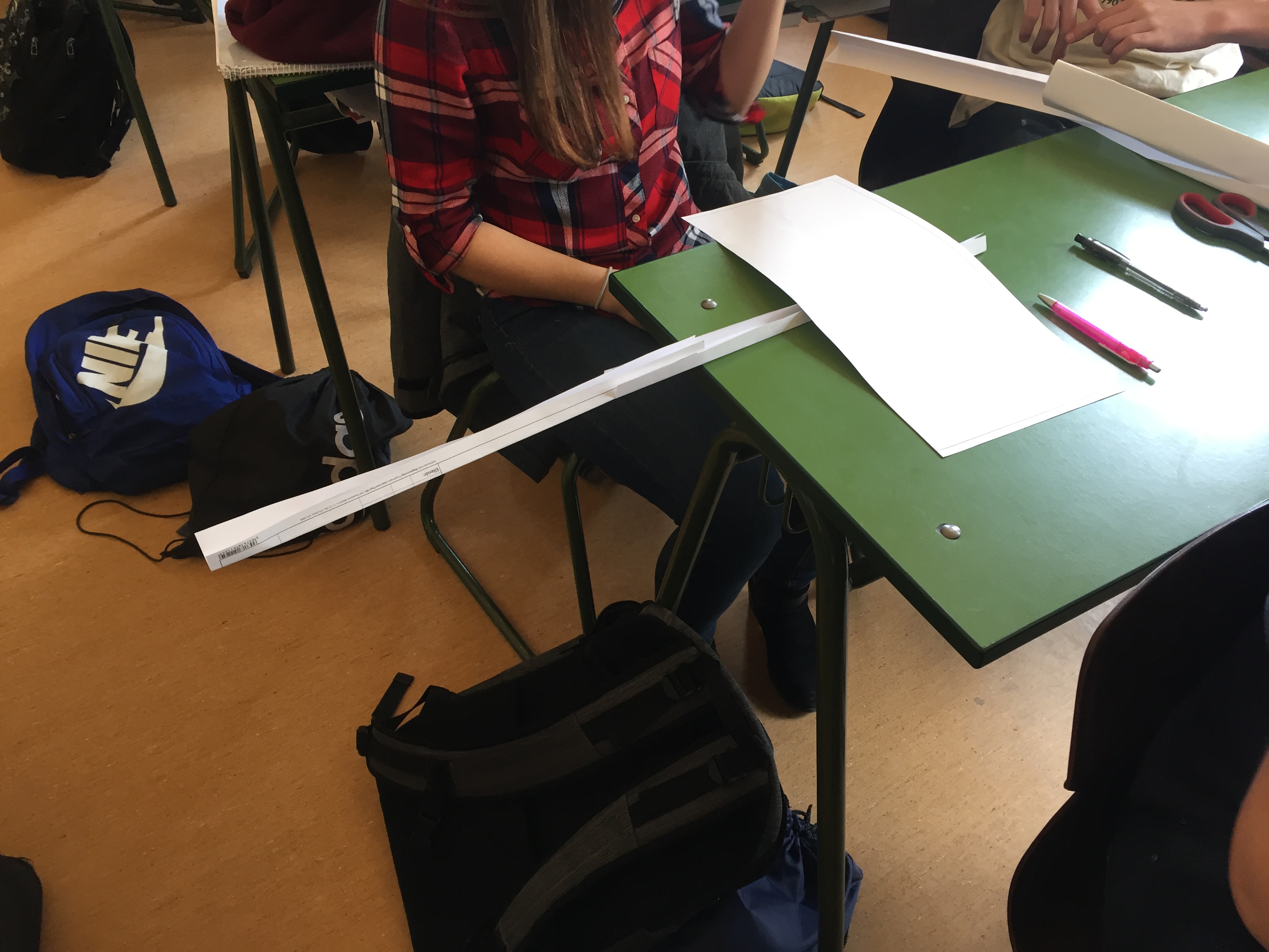 The assignment: Create a cantilever out of a single A3 paper “biting” the edge of the table, protruding at least 50 cm (20 inches)! You can fold, cut, glue the paper – scissors, box cutter, ruler, glue stick can be used. You cannot glue the workpiece to the tabletop, you cannot use adhesive tape or foreign material.