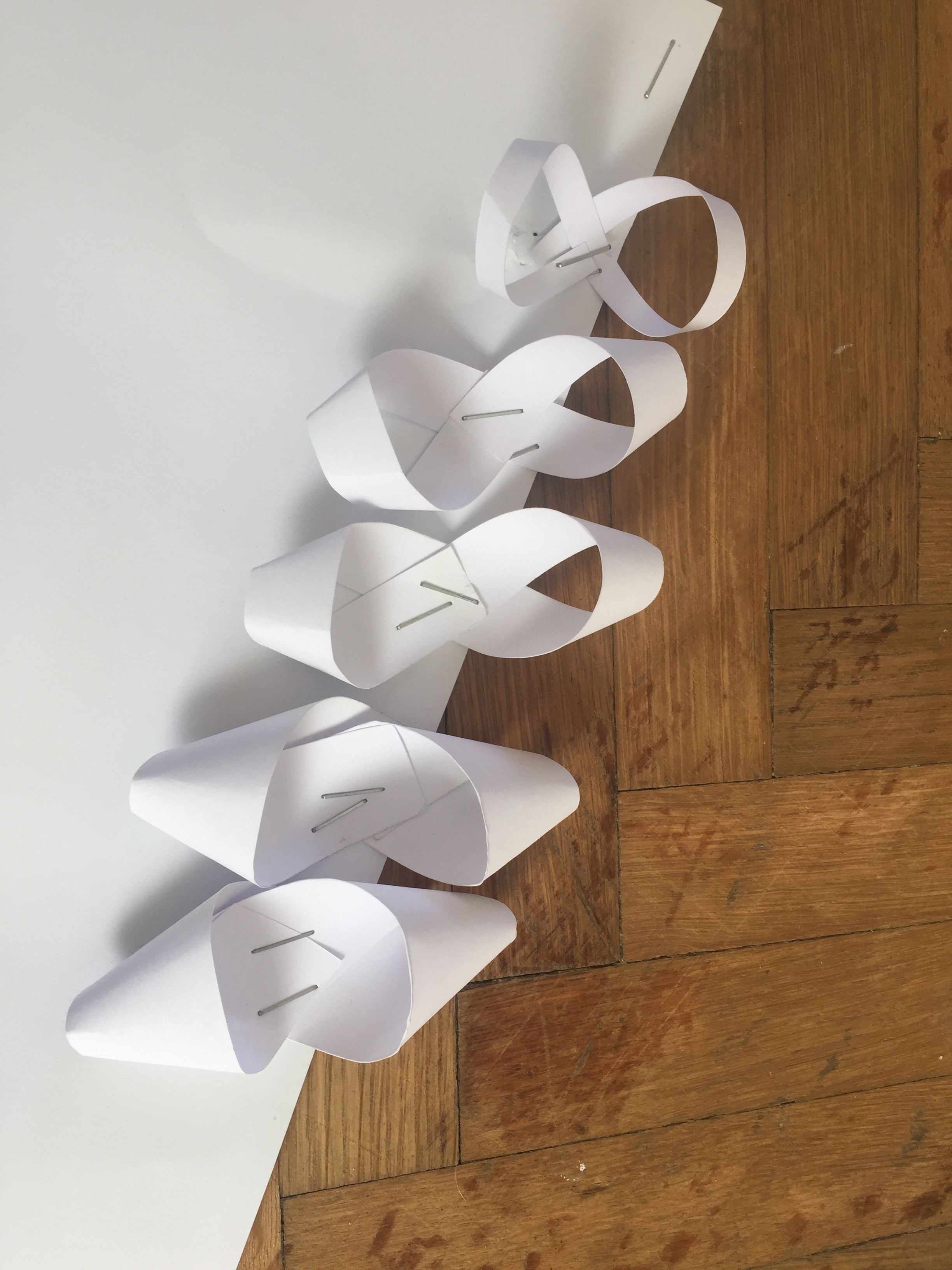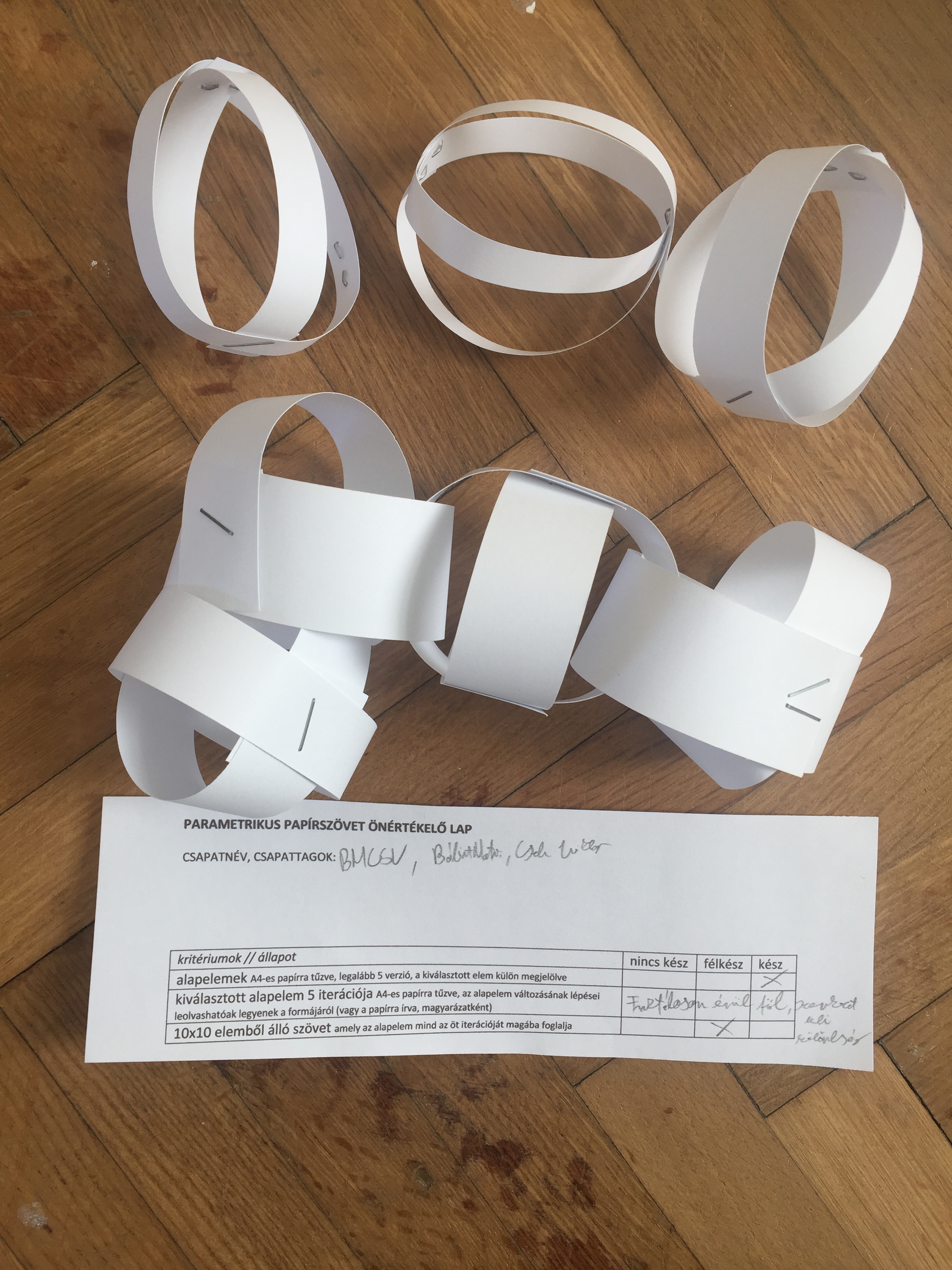 - Találjatok ki egy alapelemet és annak 5 iterációját (változtass meg 1-1 paramétert – szélesség, összméret, hajtás szöge, stb.) – ehhez próbáljatok ki jónéhány formát, gondoljátok végig, hogy sorolható-e, gyorsan le tudtok-e gyártani belőle sokat, izgalmas formát fog-e kiadni a sokaság?