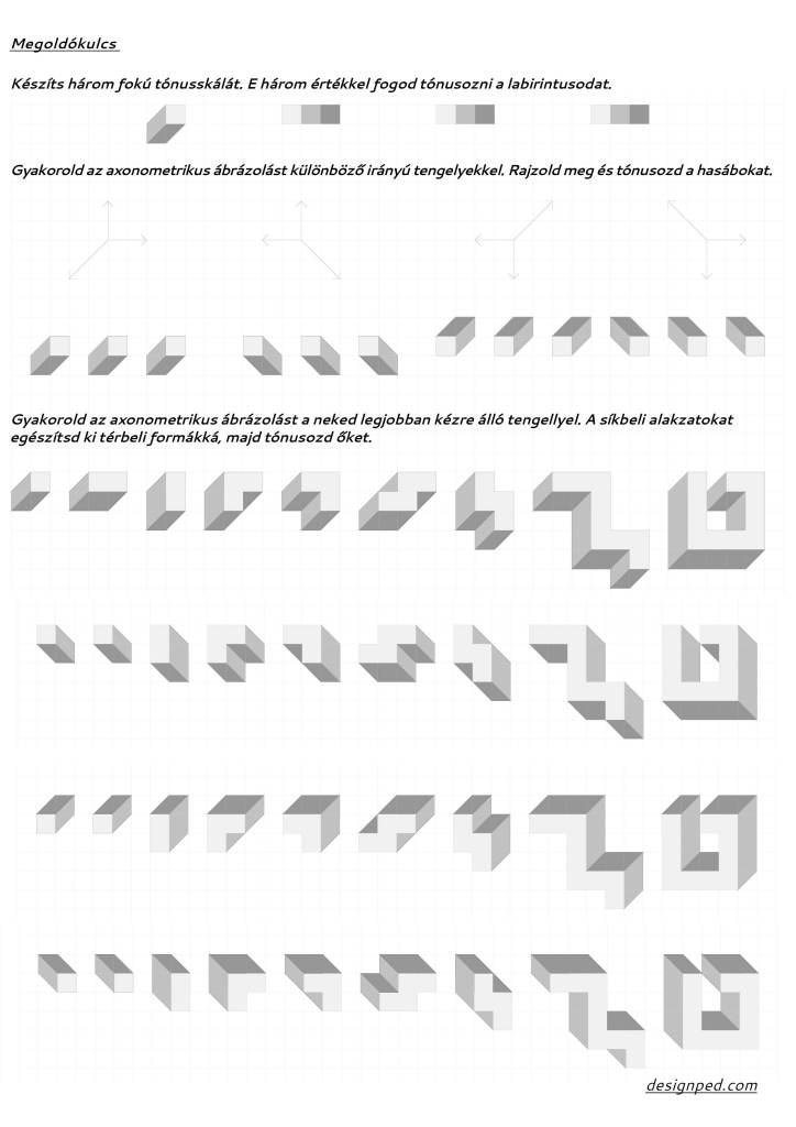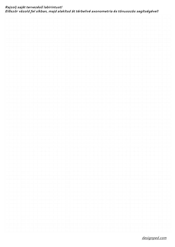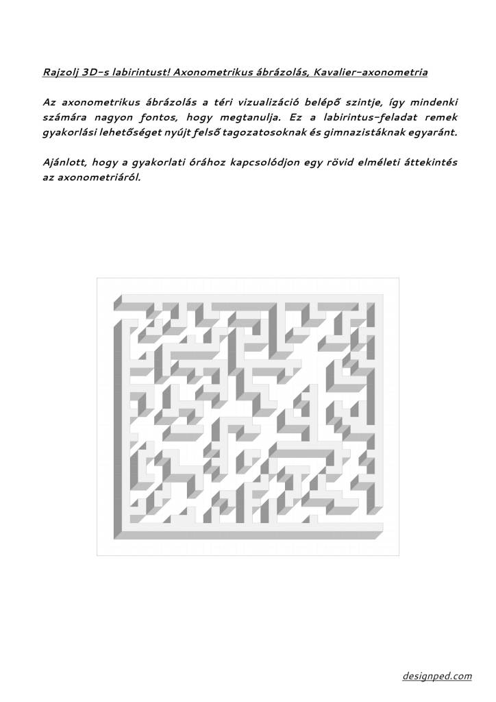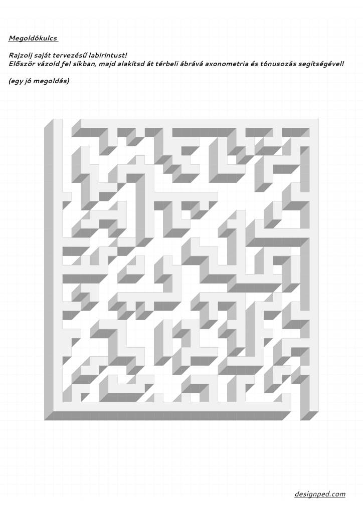 Az axonometria a téri ábrázolás “belépő szintje”, ezért mindenki számára fontos, hogy ismerje. Ez a labirintus-feladat kiváló gyakorlási lehetőséget nyújt felsősök és gimnazisták számára. (Ügyes negyedikesekkel is kipróbálhatjuk!)