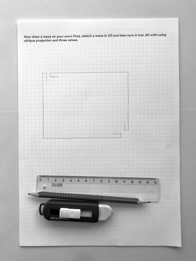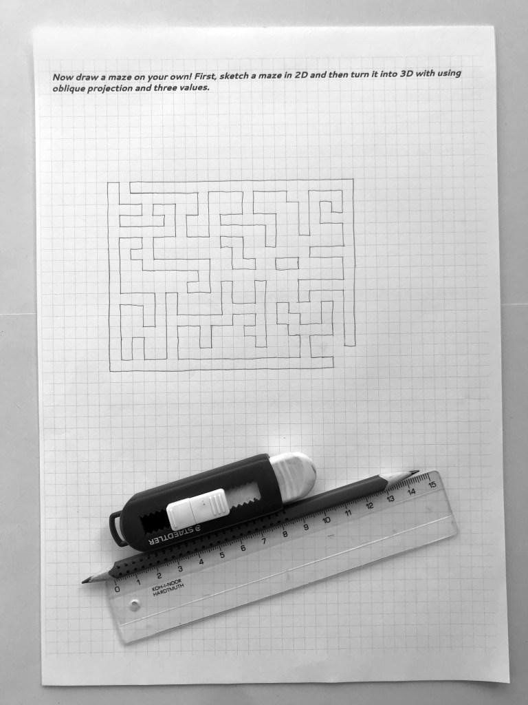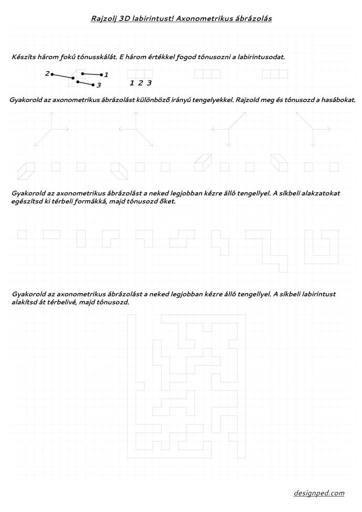A Moholy-Nagy Vizuális Modulok Környezetkultúra kutatásában kipróbáltam 9. osztályban, majd abból okulva, a tanulságokat beépítve készítettem ezt a feladatlapot, melyet innen letölthettek magyar nyelven. A diákok könnyed gyakorlás (kisebb kubusok) után egy nehezebb (labirintus) térbe emelési feladatot kapnak, majd a saját labirintusukon dolgozhatnak a saját tempójukban.