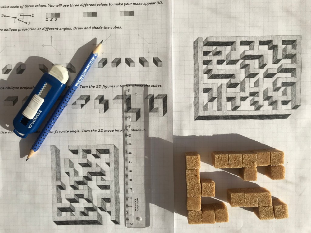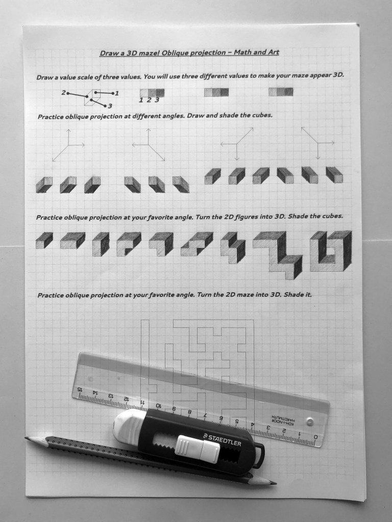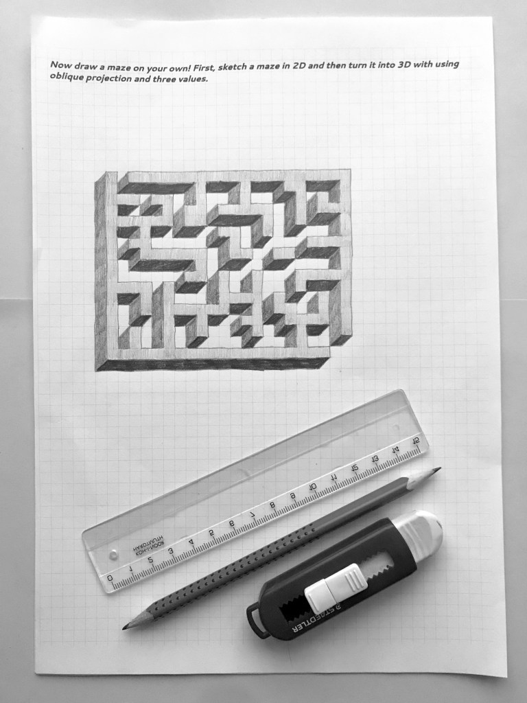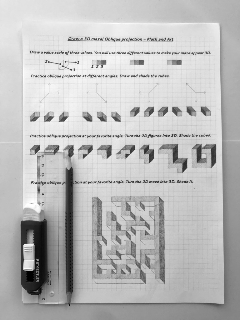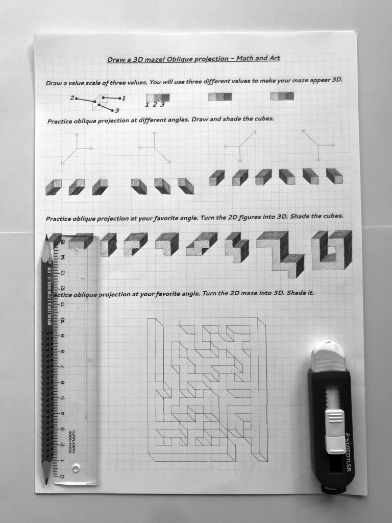 Oblique drawing is an important skill in spatial visualization. Drawing 3D mazes is an engaging way to practice oblique drawing with middle- or high schoolers. (Smart 4th graders can do it, too!)
