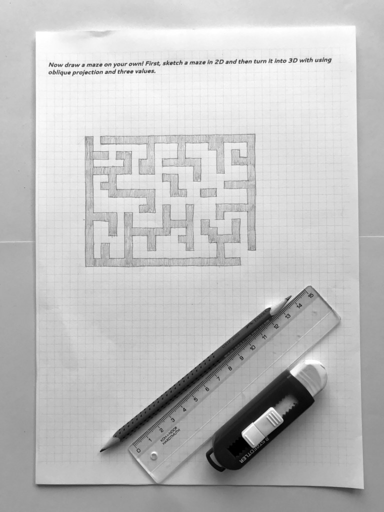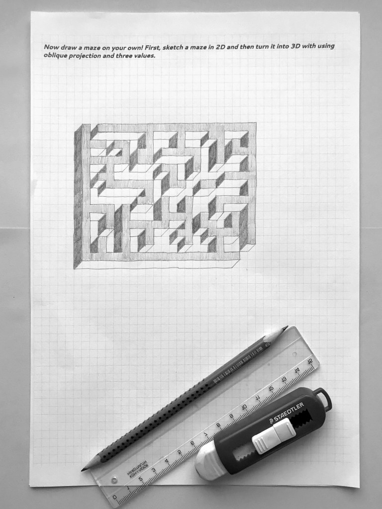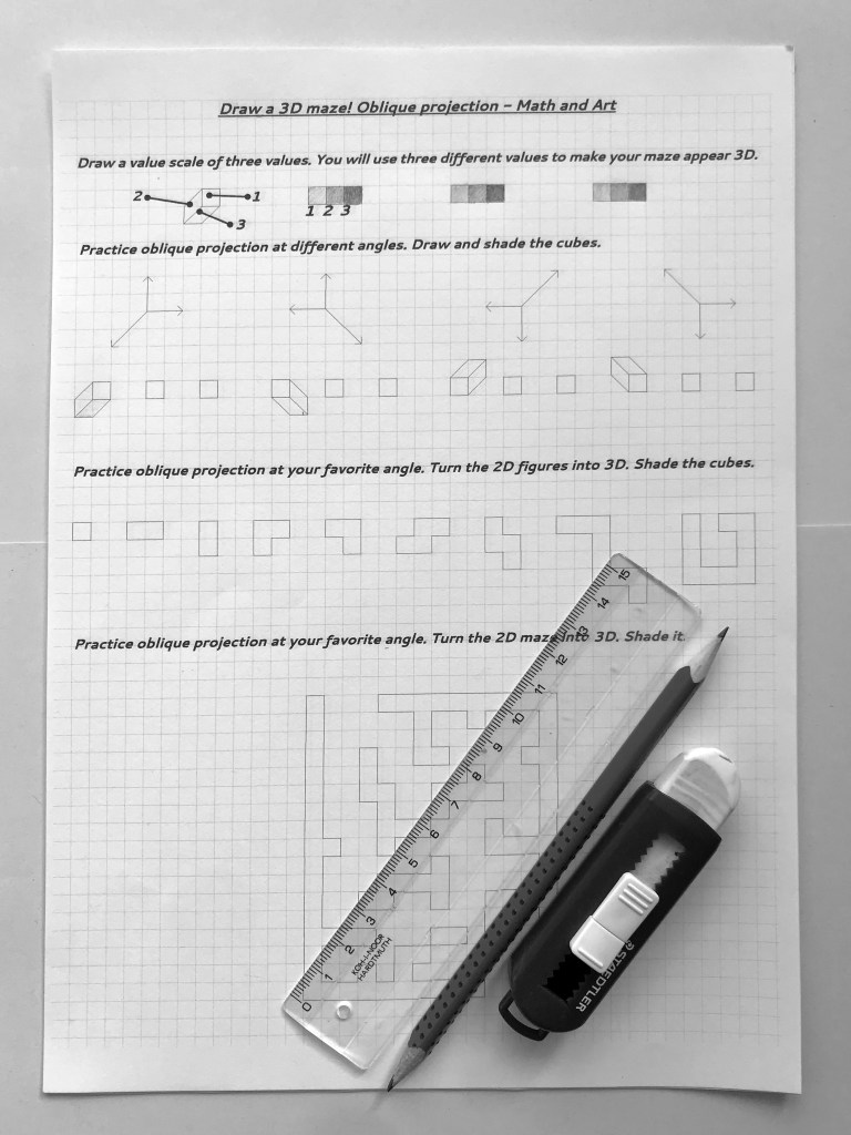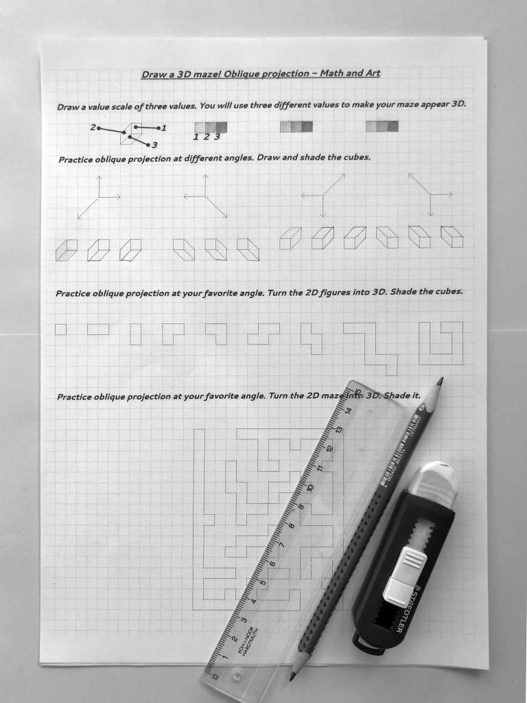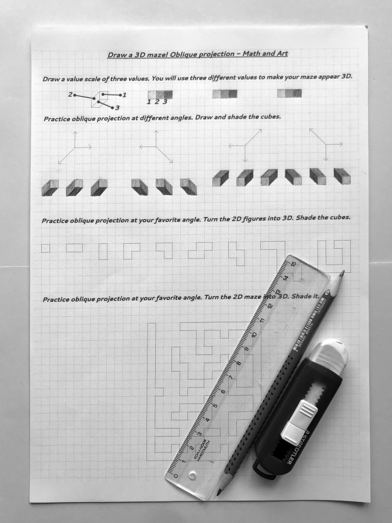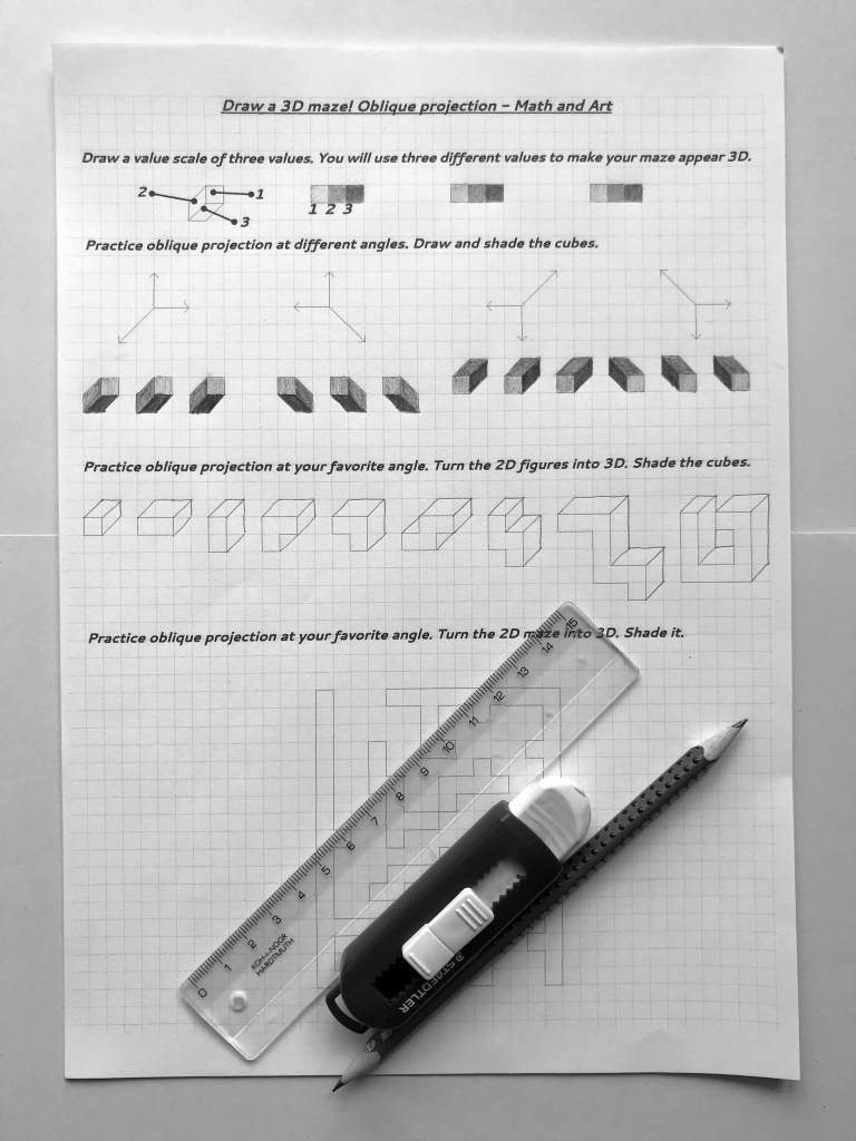 Oblique drawing is an important skill in spatial visualization. Drawing 3D mazes is an engaging way to practice oblique drawing with middle- or high schoolers. (Smart 4th graders can do it, too!)