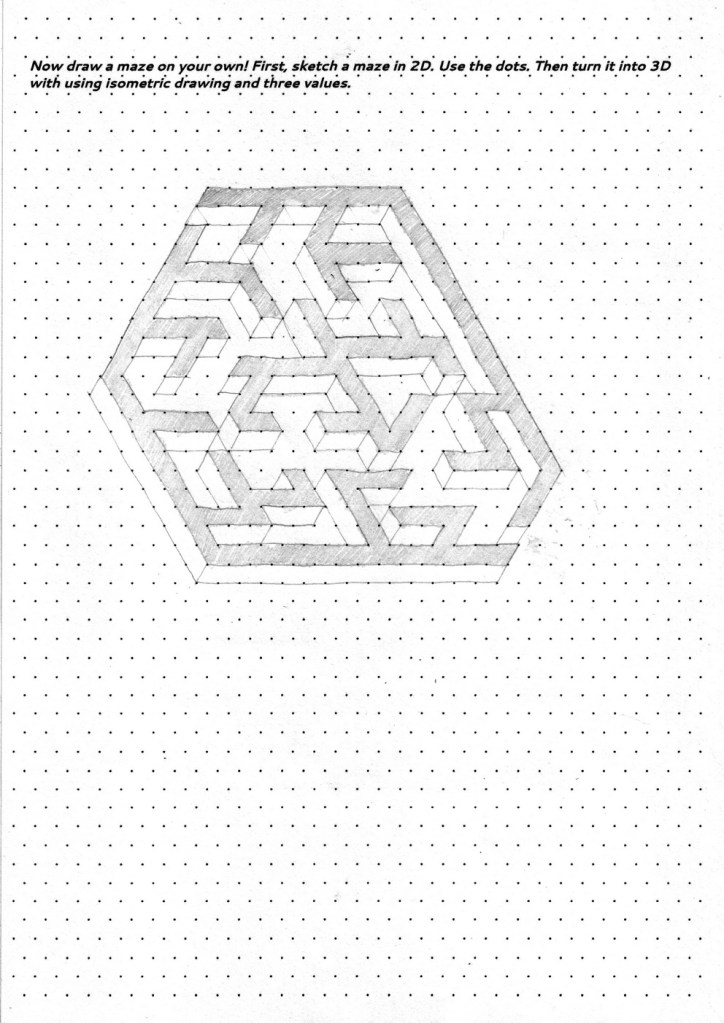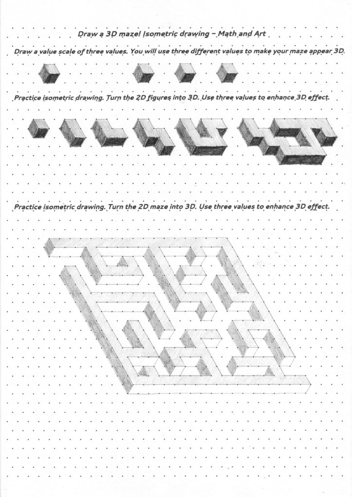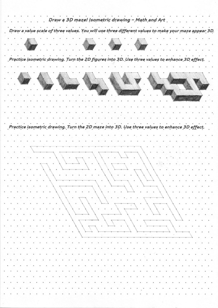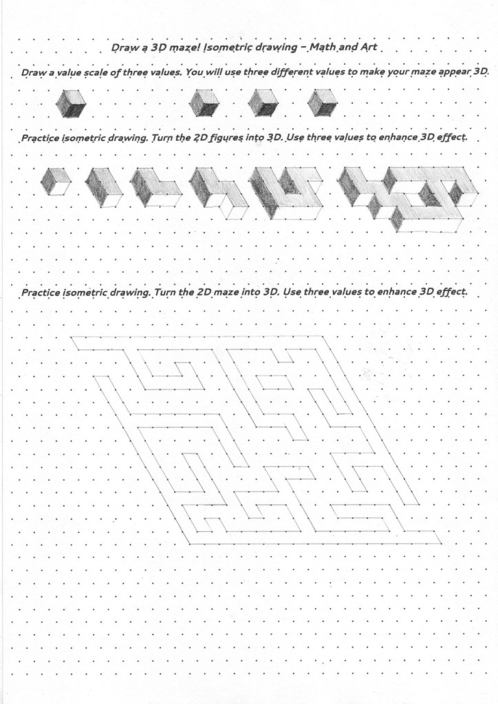 In this lesson, your students will work on figures from easy to difficult, guided through a set of 3D cube drawings and an easy maze-drawing while practicing three values. After that, they can create their own 3D maze at their own pace.
