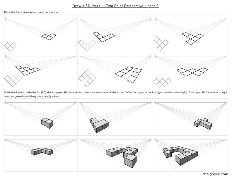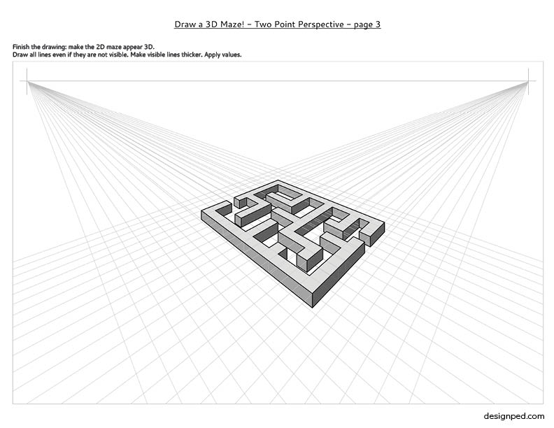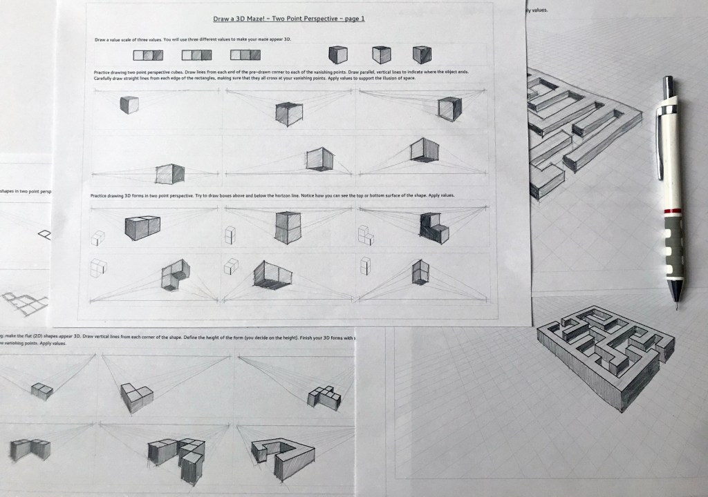 Two Point Perspective drawing is an important skill in spatial visualization. Drawing 3D mazes is an engaging way to master this skill. Your students will work on forms from easy to difficult. They will be guided through a set of 3D cube drawings and an easy maze-drawing while practicing three values. After that they can create their own 3D maze at their own pace.