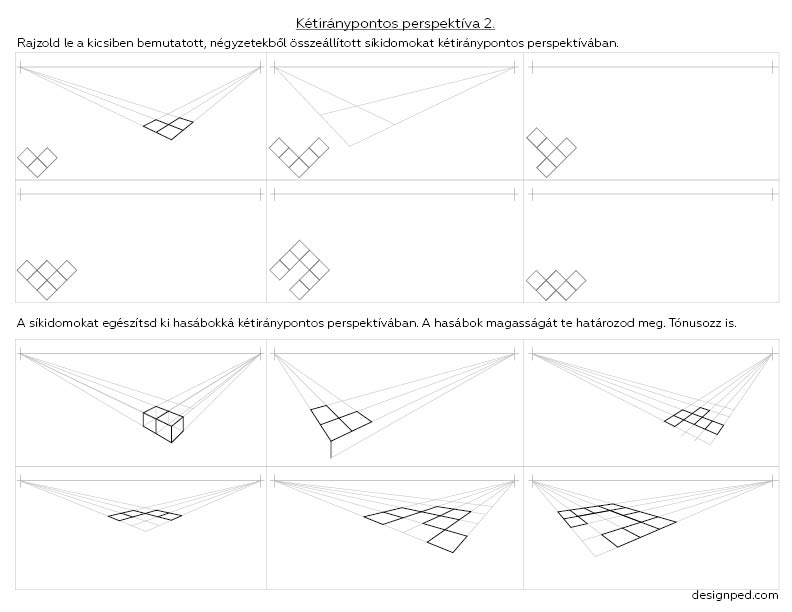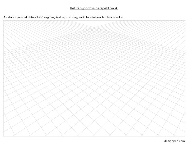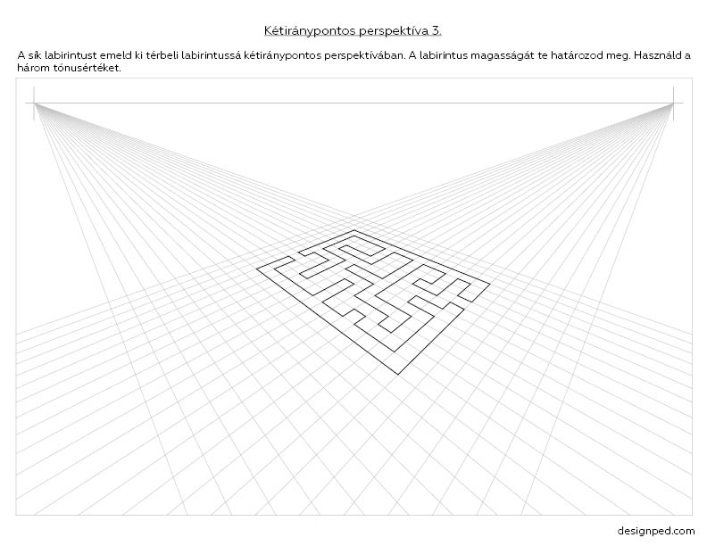 Az izometrikus, kavalier-axonometrikus és egyiránypontos labirintusok után itt van a sorozat befejező része: rajzolj térbeli labirintust kétiránypontos perspektívában! Elsősorban gimnazistáknak ajánlom. A kockától, egyszerűbb geometriai alakzatoktól jutnak el a diákok a bonyolultabb formákig, illetve a saját tervezésű labirintusig.