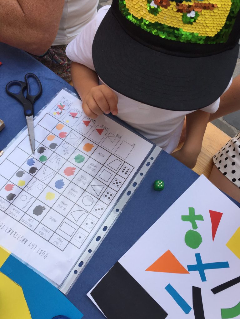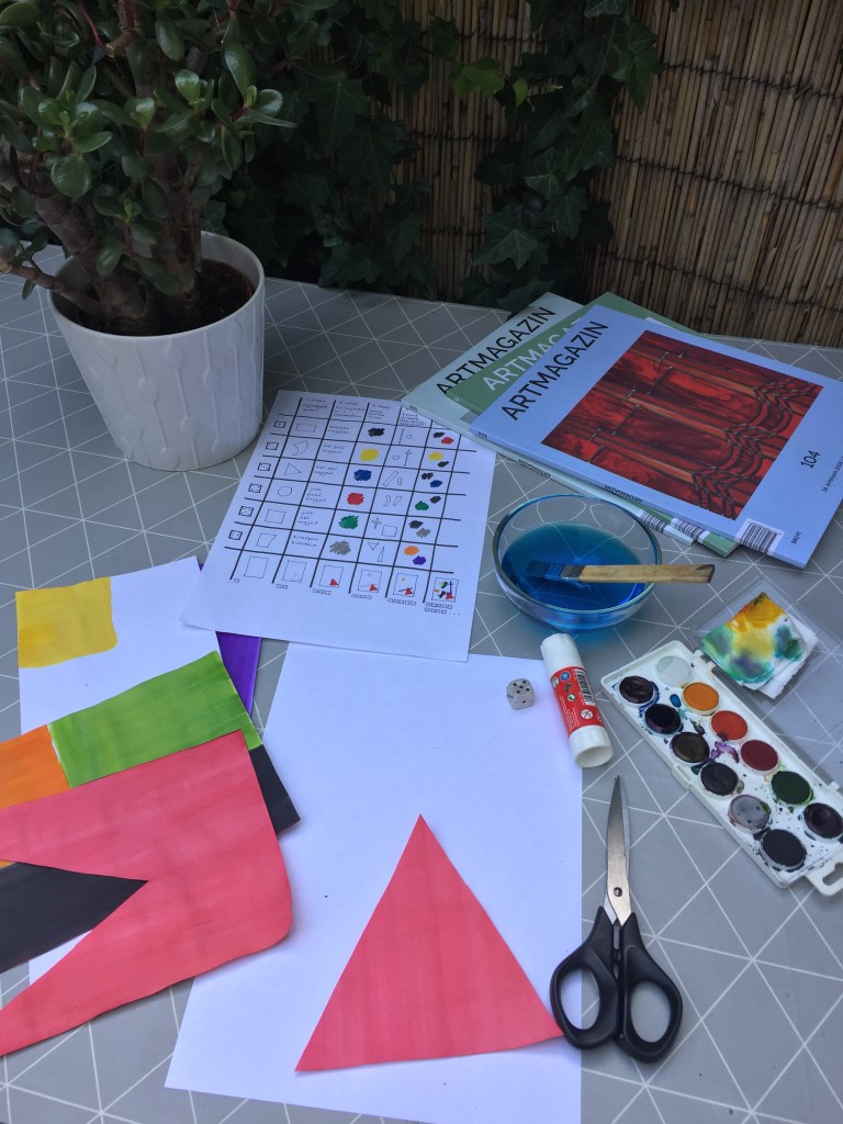 Színes papírokkal, ollóval, ragasztóval dolgozunk. Oszloponként haladunk, dobókockával választjuk ki az egyes képelemeket, amelyeket a képmezőre komponálunk. A feladatlapot itt találjátok.