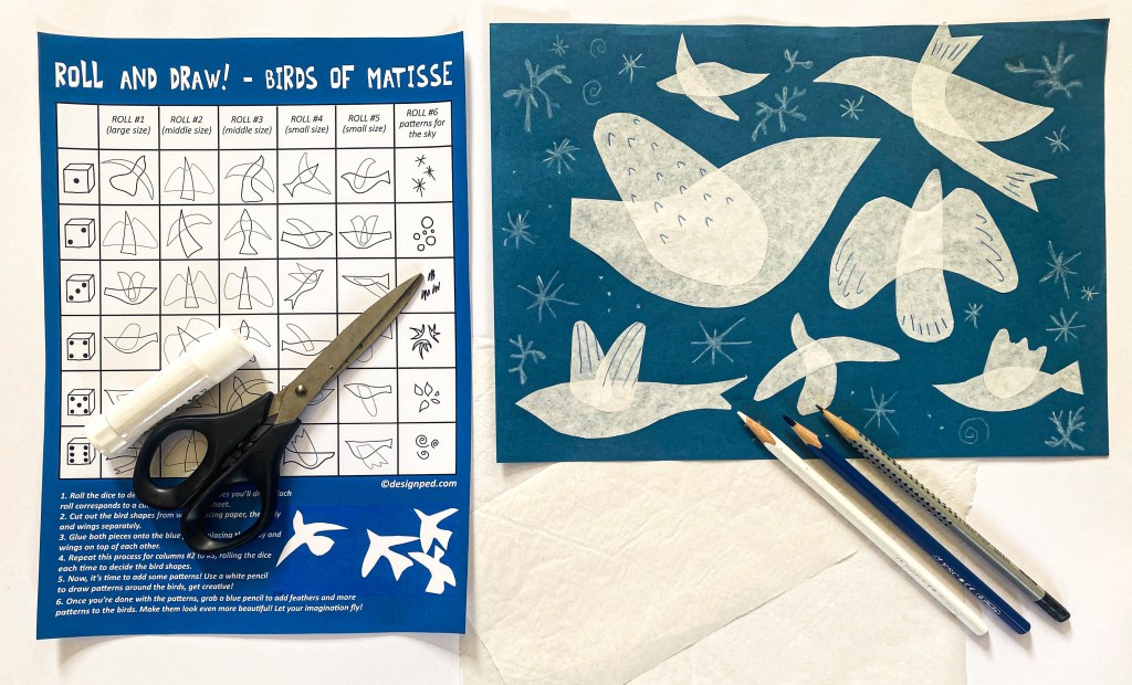 Get ready to embark on an exciting artistic journey with “Roll and Draw! – Birds of Matisse” art lesson worksheet. This engaging and interactive art game combines the thrill of dice rolling with the creativity of paper collage making. Inspired by the iconic works of Henri Matisse, this game encourages students to explore and experiment with the art of cutouts.