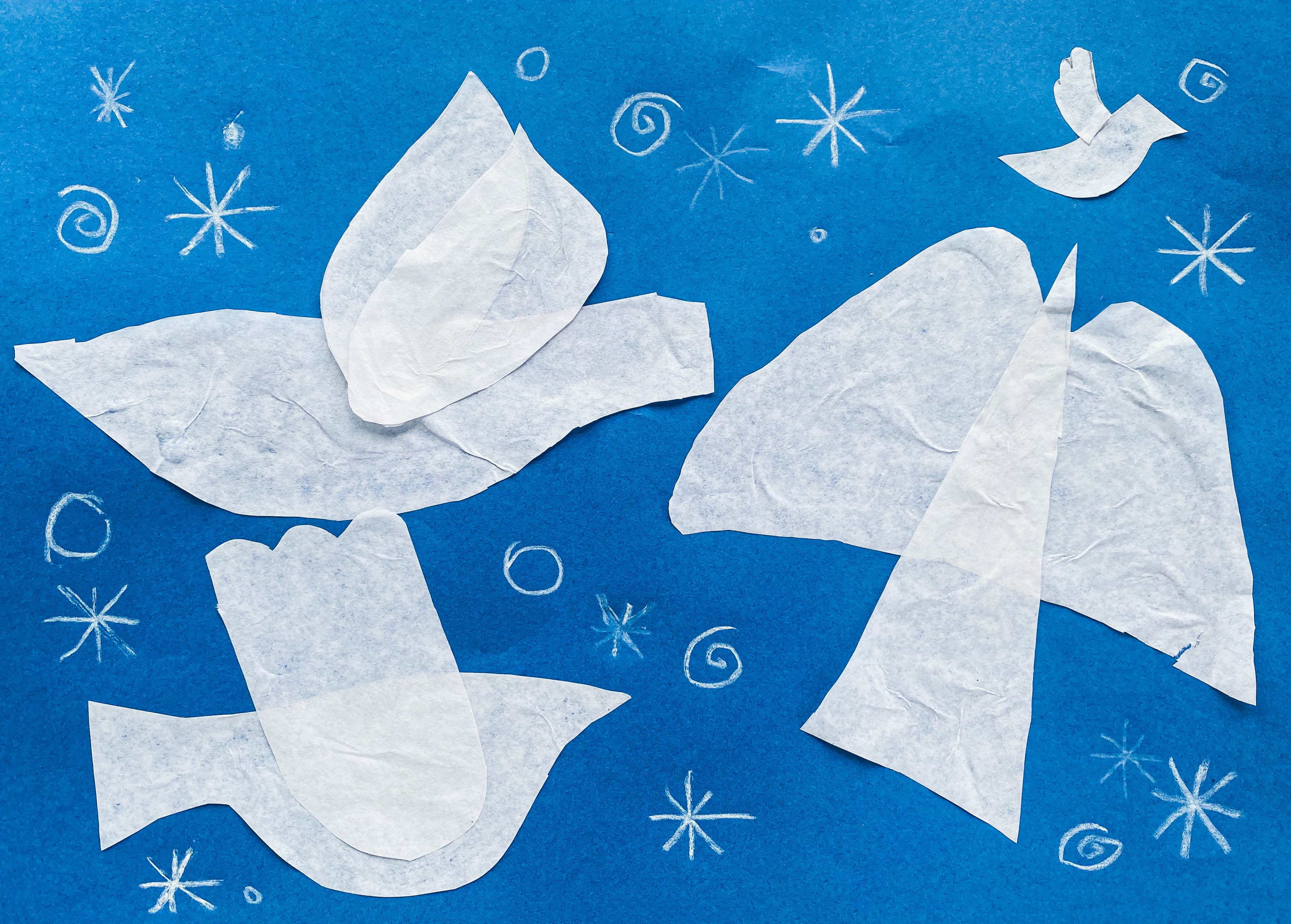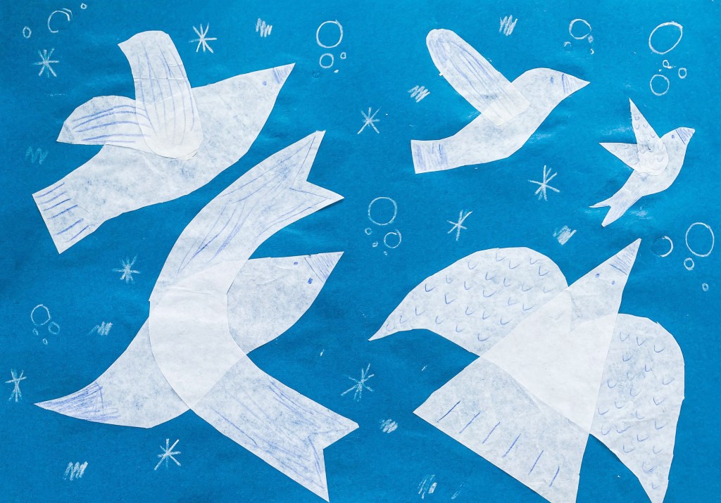- Cut out the bird shapes from white tracing paper, the body and wings separately.